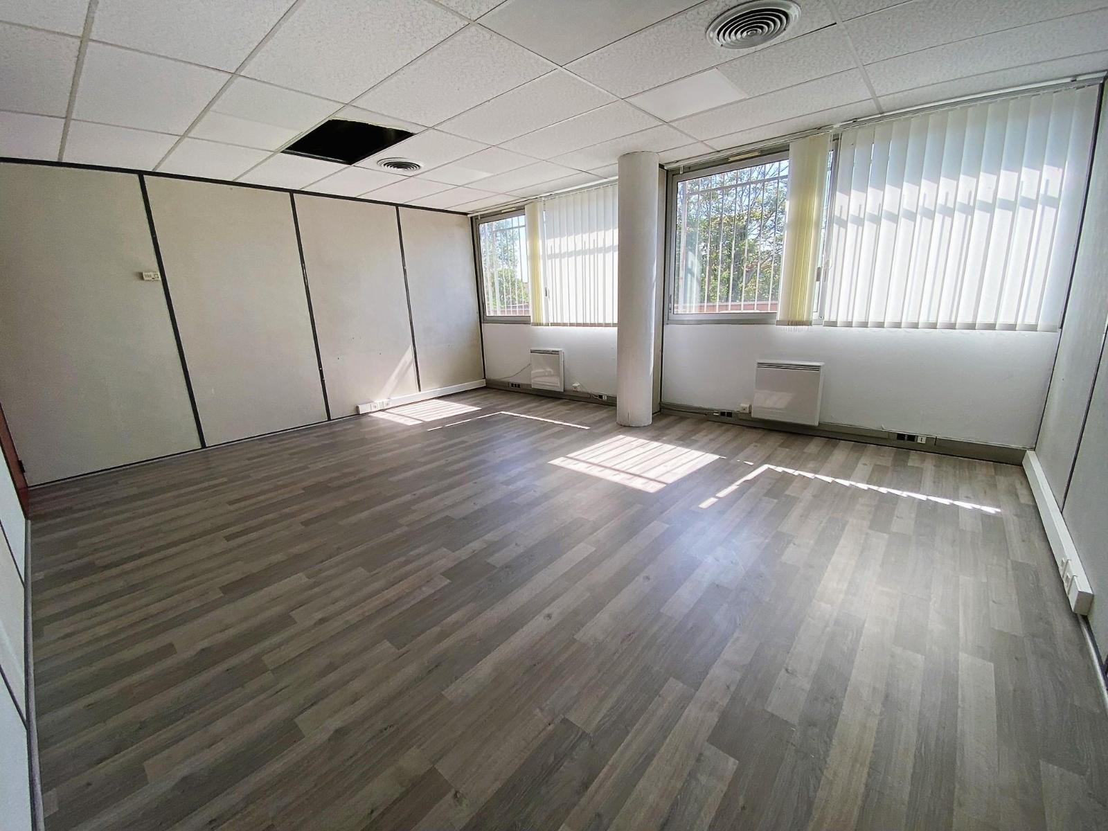 Situés en rez-de-chaussée d'un immeuble en copropriété, ces bureaux d'une surface d'environ 61 m² se composent de deux grands open spaces, pouvant chacun accueillir 3 à 4 postes de travail. Sanitaire privatif.Les bureaux sont entièrement climati...
