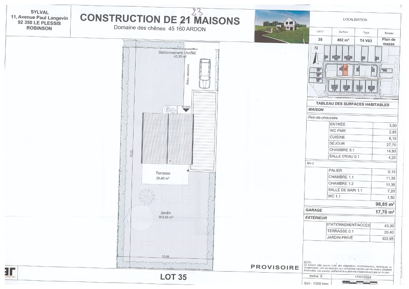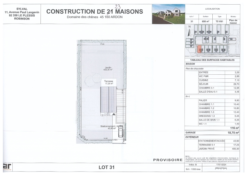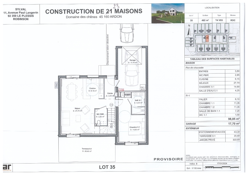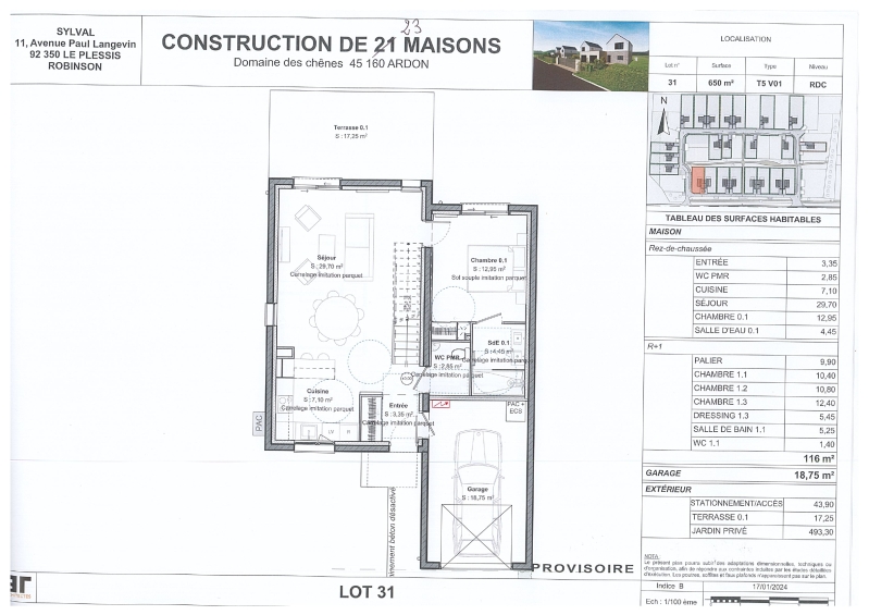 ARDON, proche bourg dans nouveau lotissement beau pavillon F4 comprenant : au RDC : une entrée avec placard, un séjour avec cuisine aménagée et équipée (hotte + plaques), un wc, une suite parentale avec dressing et salle d'eau. A l'étage : un palier...