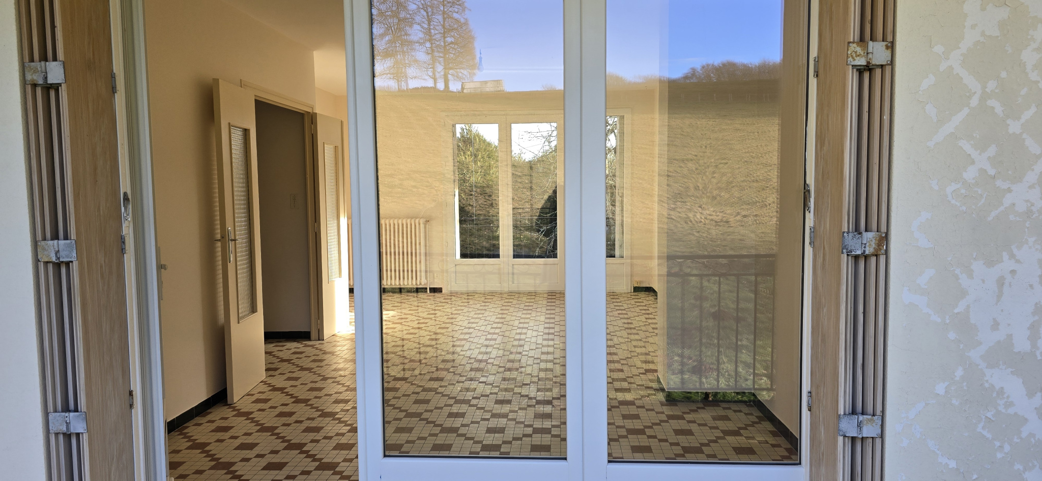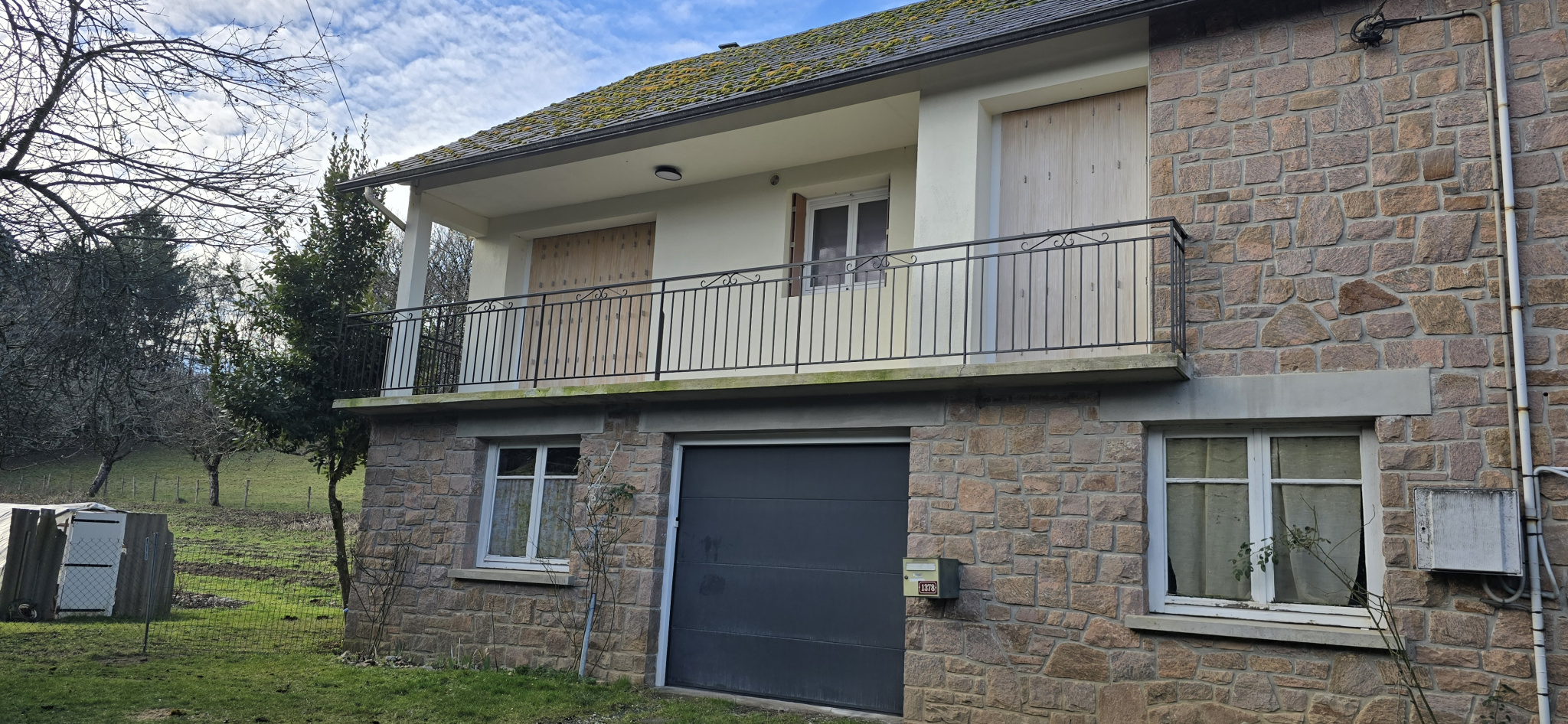 Maison mityenne par un côté, comprenant en sous-sol un grand garage et une remise.A l'étage , une grande entrée, une cuisine simple , un séjour traversant avec 2 balcons terrasses, salle de bains, wc, 1 chambre avec placard, une chambre avec porte-fenêtre...