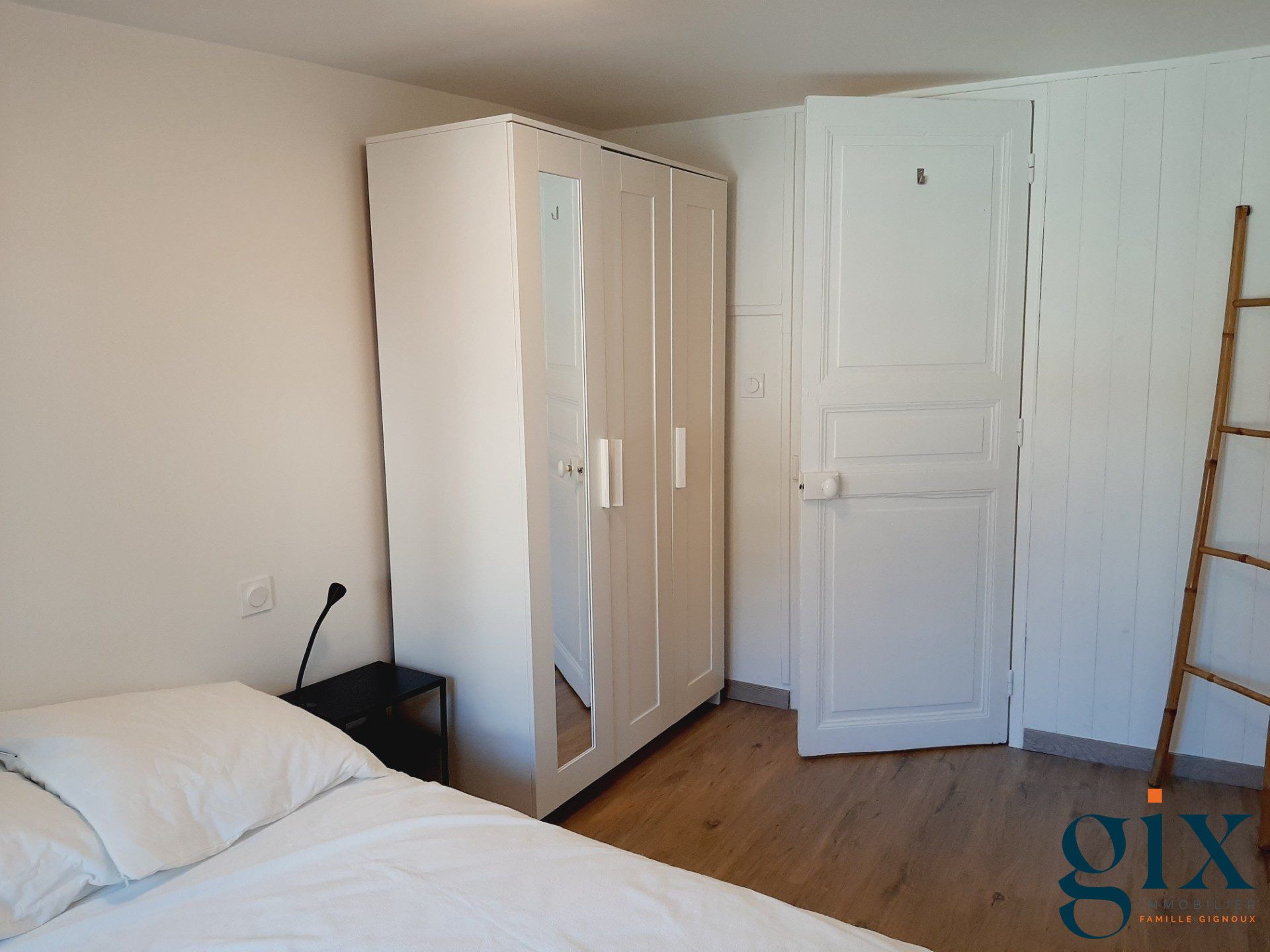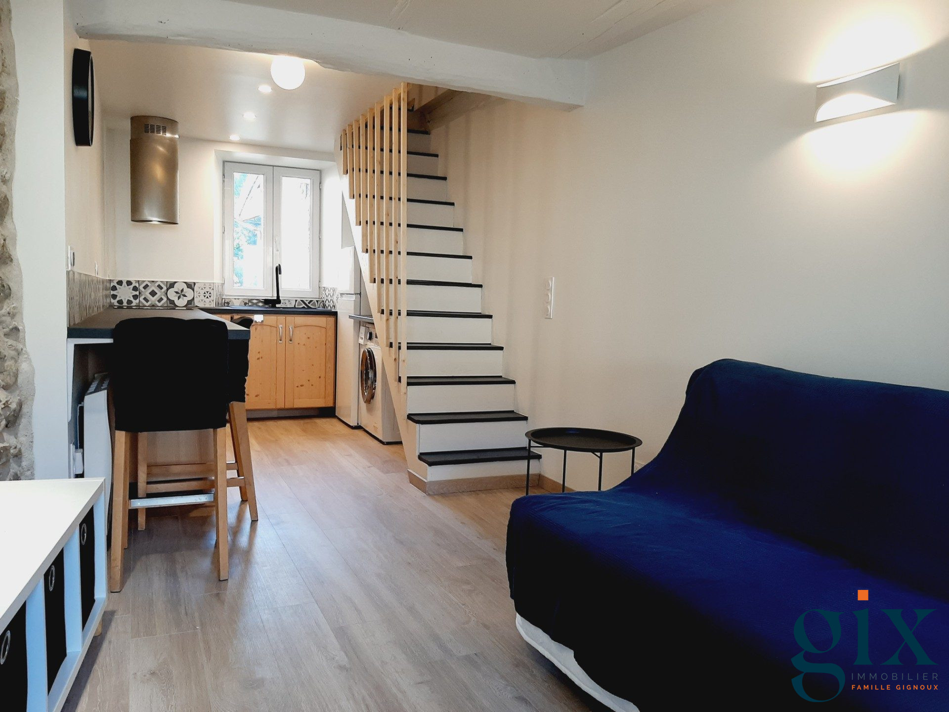 Jolie maison de rue en pierre rénovée, louée MEUBLEE, sans terrain, comprenant en rez-de-chaussée une cuisine équipée ouverte sur le séjour et un cellier. Au 1er étage, 1 chambre avec une mezzanine, une salle d'eau et un wc séparé.