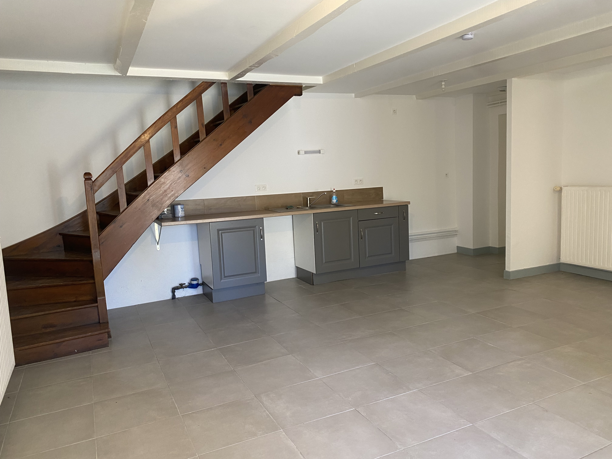 Réf 5049 : - CLÉRIEUX CENTRE-VILLAGE - A LOUER : Maison T3 MEUBLÉ sur deux niveaux d'habitation d'environ 46m² habitable, comprenant au rez-de-chaussée : Un séjour/cuisine de 18m² avec cuisine incorporée (four, four à micro-ondes, réfrigérateur, plaq...