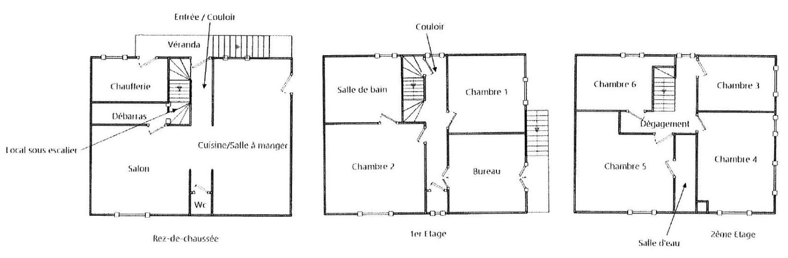 - 1er étage : Trois chambres - Salle de bains avec WC + WC indépendant