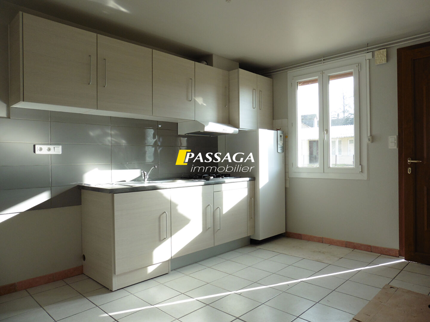 1° Et. : une cuisine aménagée (meubles hauts et bas, plaque de cuisson vitrocéramique, hotte, frigi...