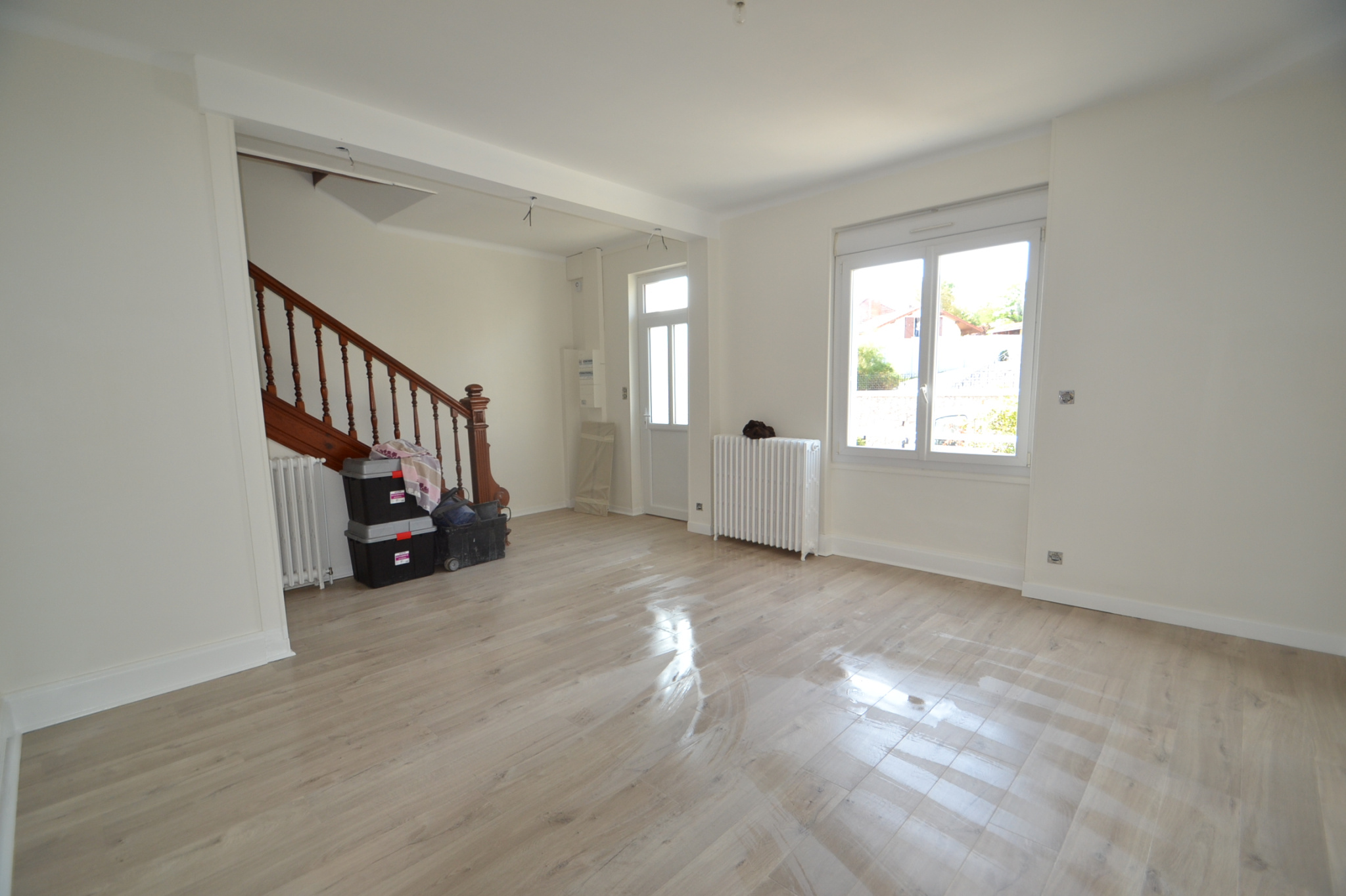 maison comprenant au rez de chaussée : cuisine aménagée, séjour, wc, au 1er étage : deux chambres, salle d'eau, wc. Caves. Chauffage gaz de ville. Jardin. Libre le 01er Janvier 2026 (assurance loyer impayé)