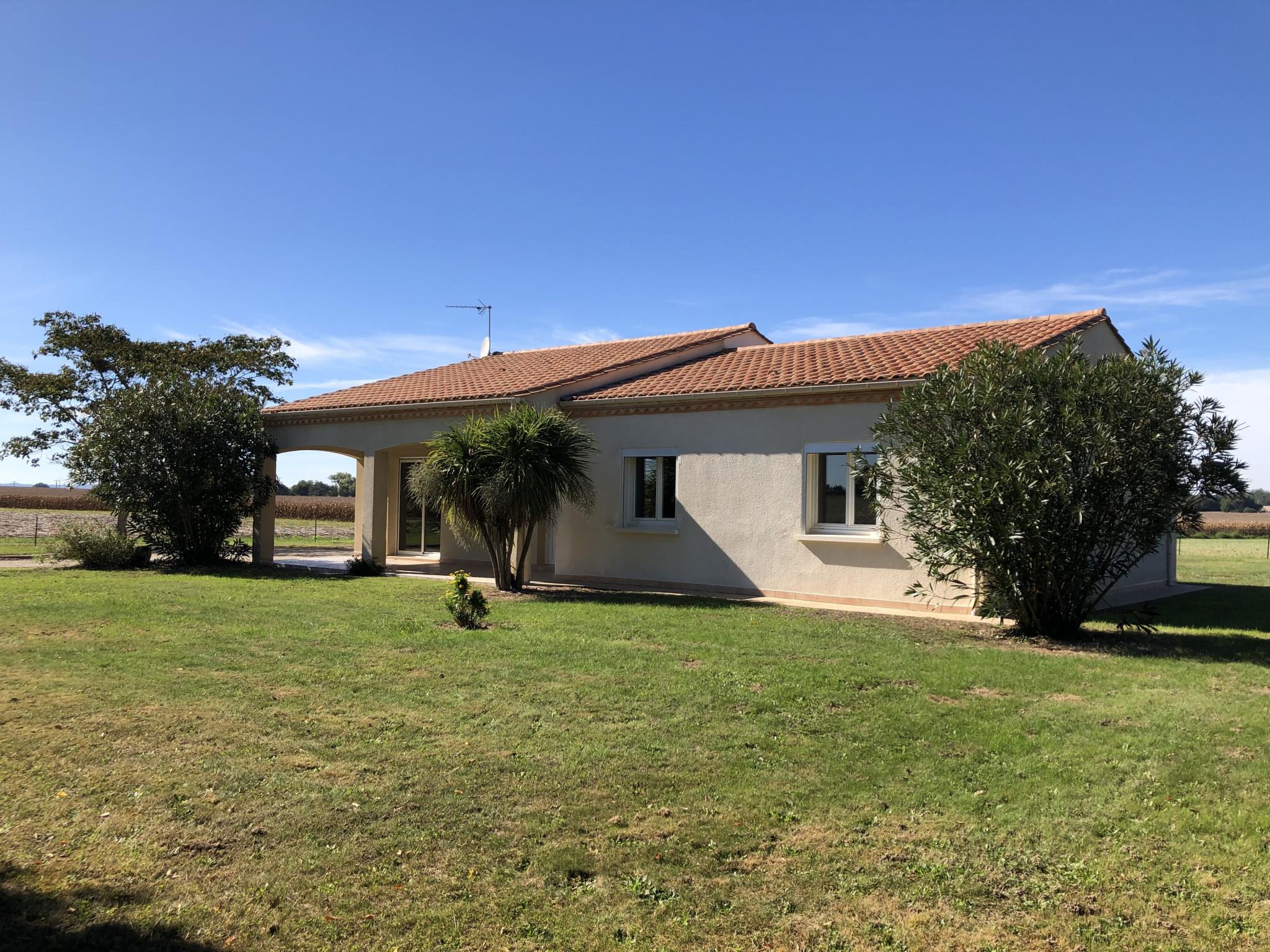 réf. 1443 : BIRAC SUR TREC , à louer maison individuelle comprenant salon séjour climatisé, grande cuisine équipée donnant sur une terrasse, 3 chambres, un bureau, salle de bains avec double vasque, baignoir eet douche, cellier, double garage. Beau terrain c...