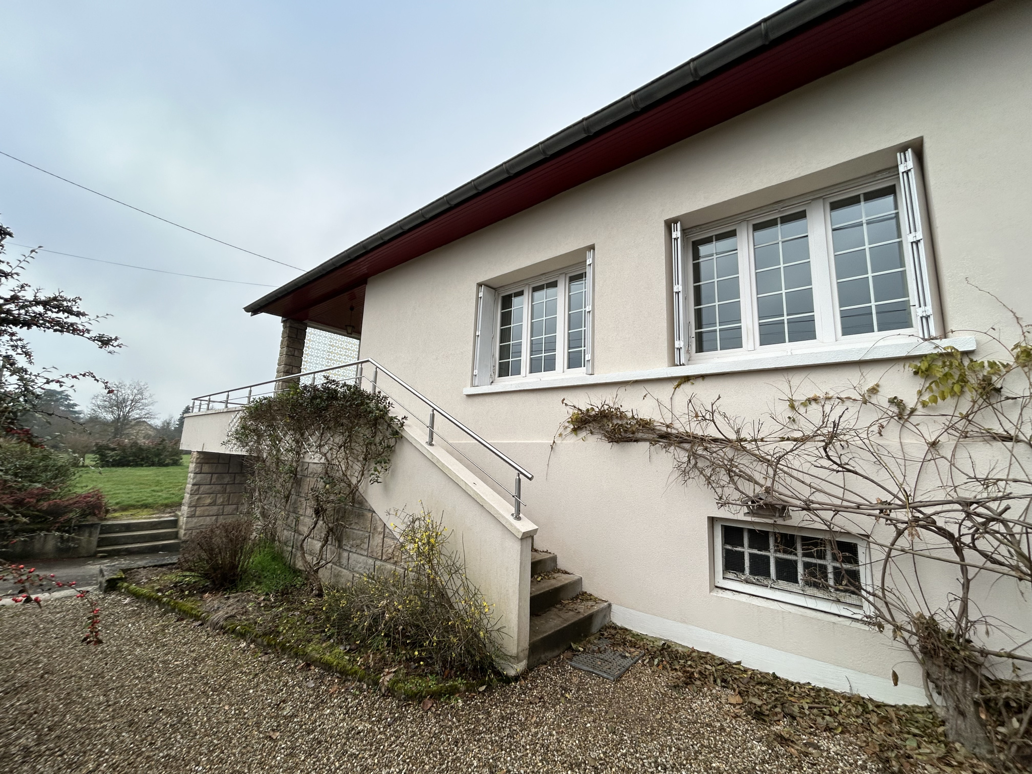 "Roussemeau" - Pavillon de plain pied implanté au milieu de son terrain pentu, comprenant : entrée avec placard, séjour avec poêle à granulés et accès direct sur la terrasse, cuisine aménagée et équipée, dégagement, 3 chambres, salle de bains, WC et...