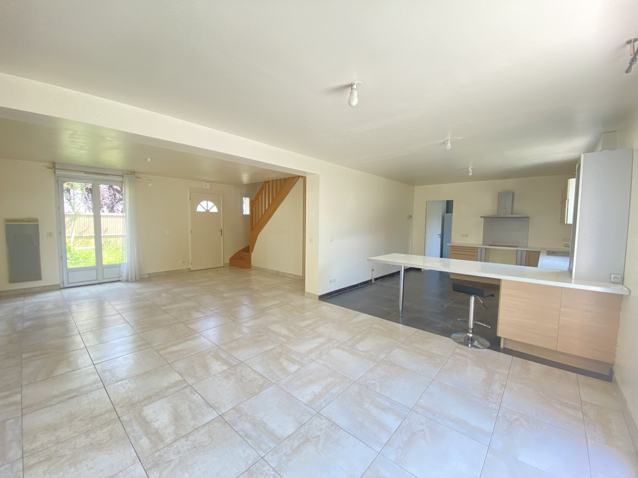 Au rez -de -chaussée : cuisine aménagée (hotte) ouverte sur séjour double, accès sur terrasse, cellier / buanderie, 1 chambre avec placard, salle d'eau, wc indépendant.