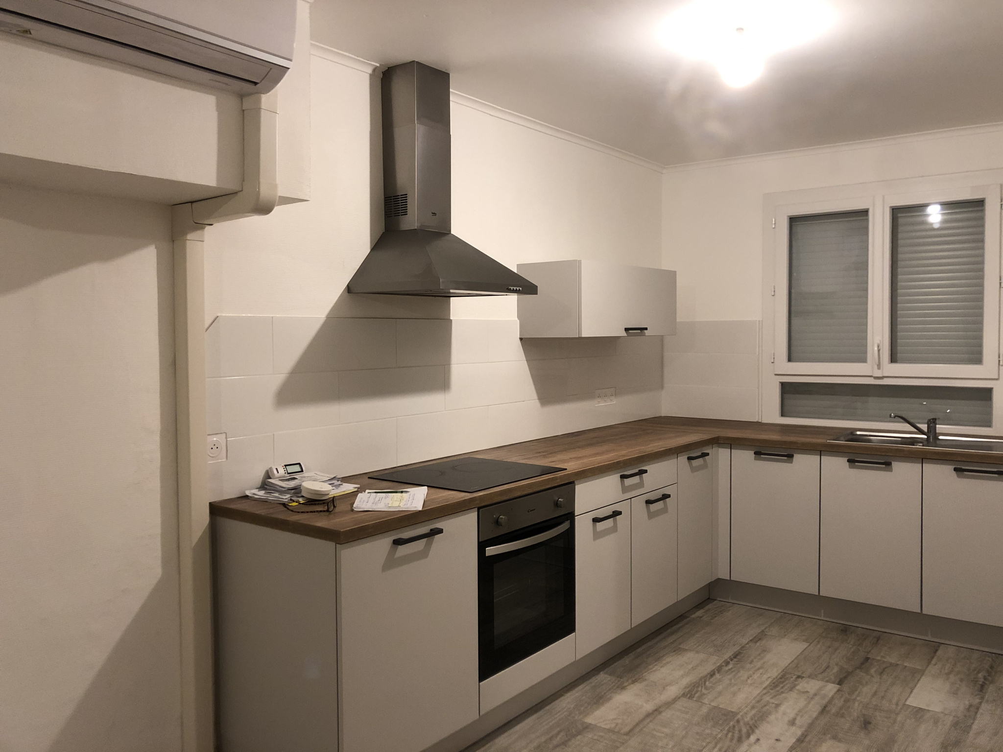 En RDC: Grand séjour avec cheminée, cuisine aménagée et semi équipée (plaque et hotte), une chambre avec placard, une salle d'eau, wc, cellier, buanderie.