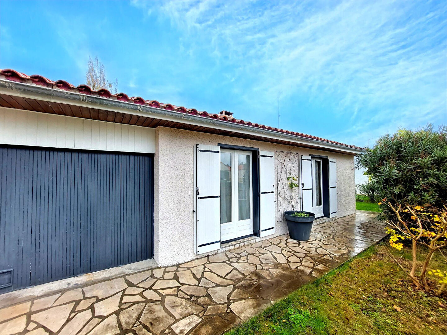Terrasse avec préau - jardin et stationnement.