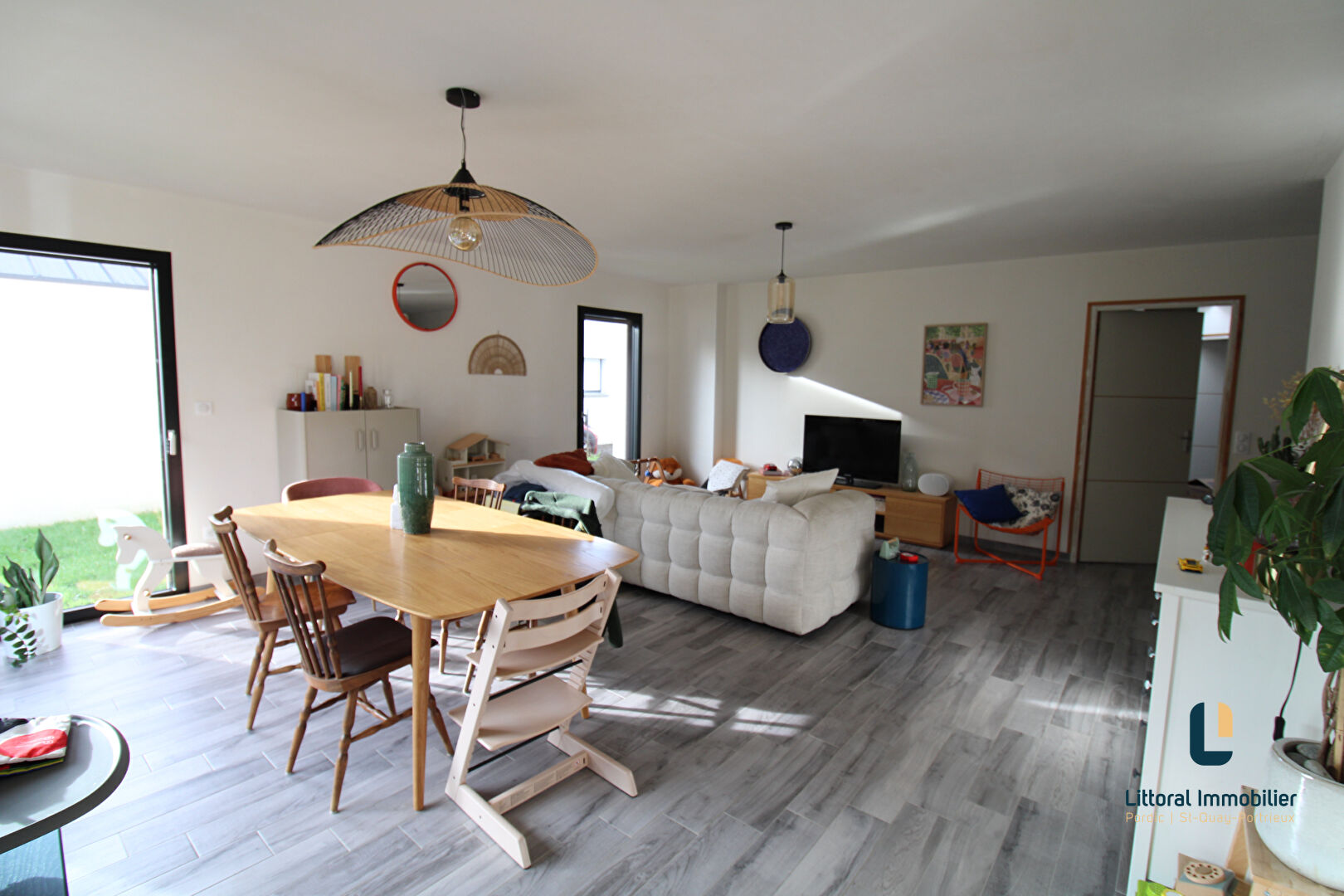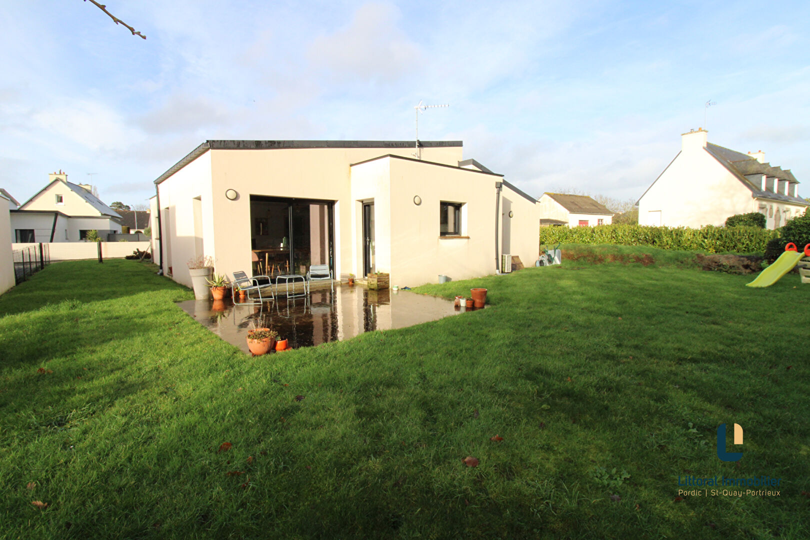 PLÉRIN PROCHE PORT DU LÉGUÉ, Très belle maison contemporaine de 7 pièces meublée sur un terrain clos et arboré de 1 120 m² avec PISCINE CHAUFFÉE, comprenant :