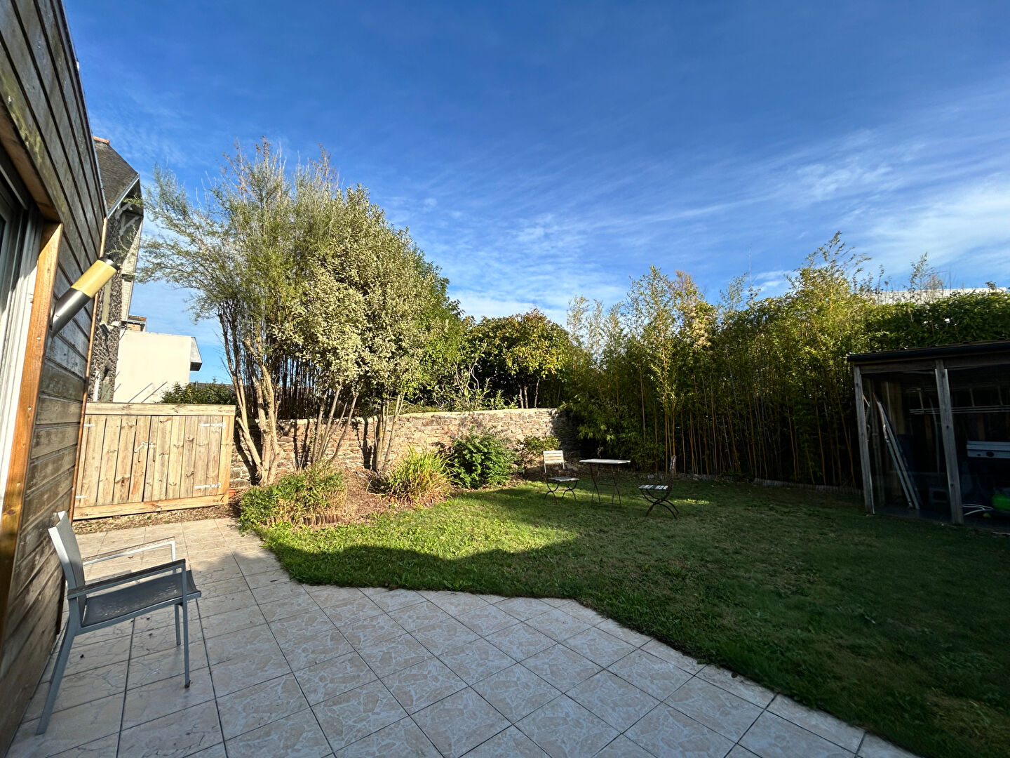 ST BRIEUC, entre la gare et le centre ville, maison de ville 5 P. totalement rénovée comprenant : entrée, séjour salon, cuisine équipée ouvrant sur une cour clos de murs et parfaitement exposée, 3 chambres, véranda, salle de bains, WC., garage