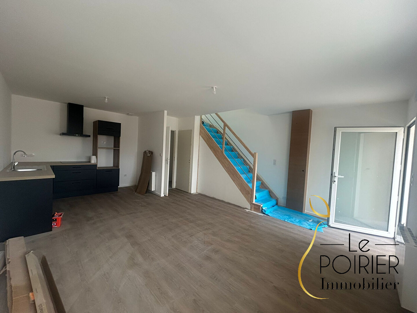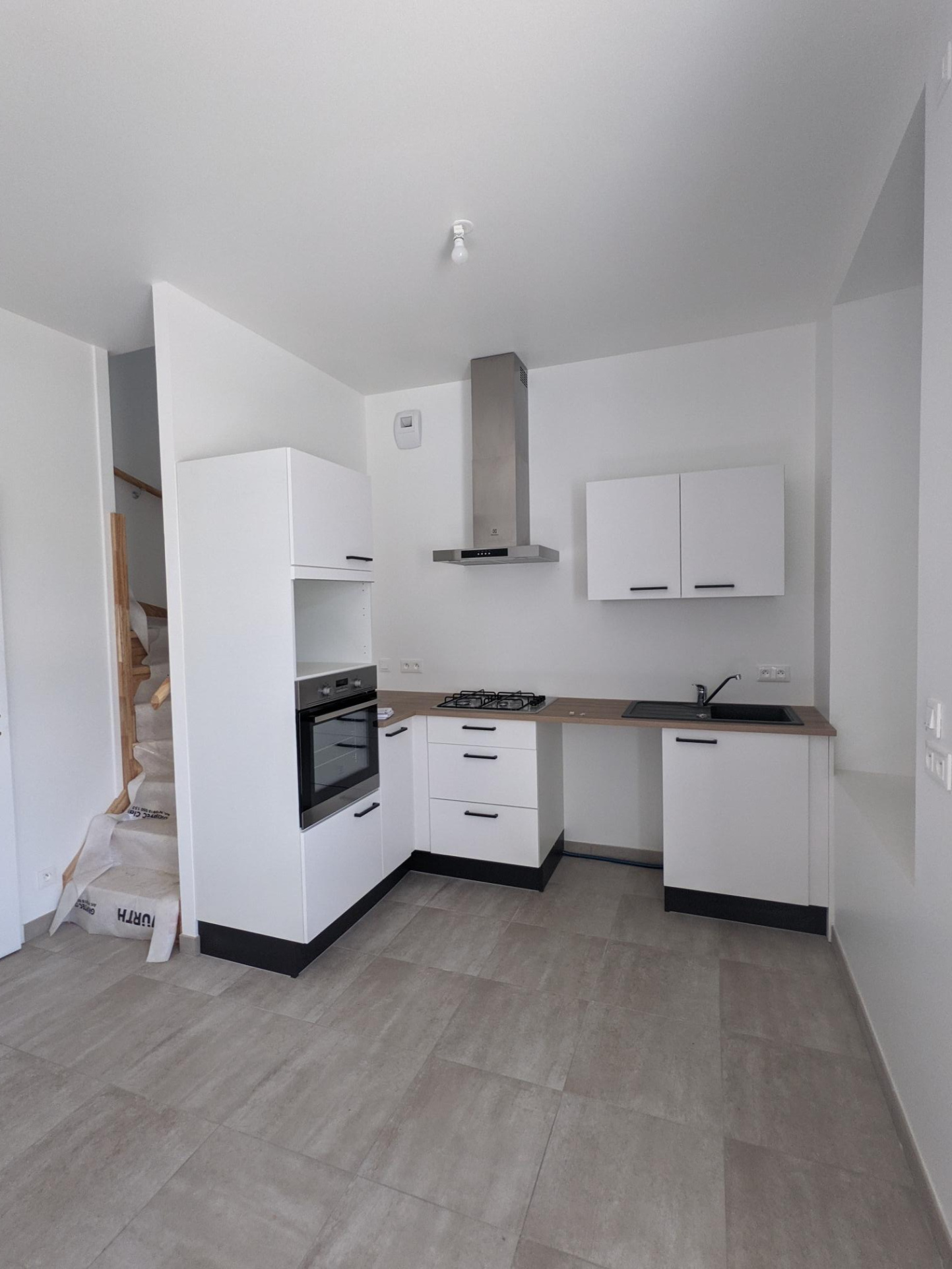 RDC : séjour salon avec coin cuisine aménagé et équipé (évier, plaque de cuisson à induction, hotte, four, lave-vaisselle, ensemble de placards neufs), 1 chambre (placard) avec bureau en mezzanine, salle d'eau, wc séparé