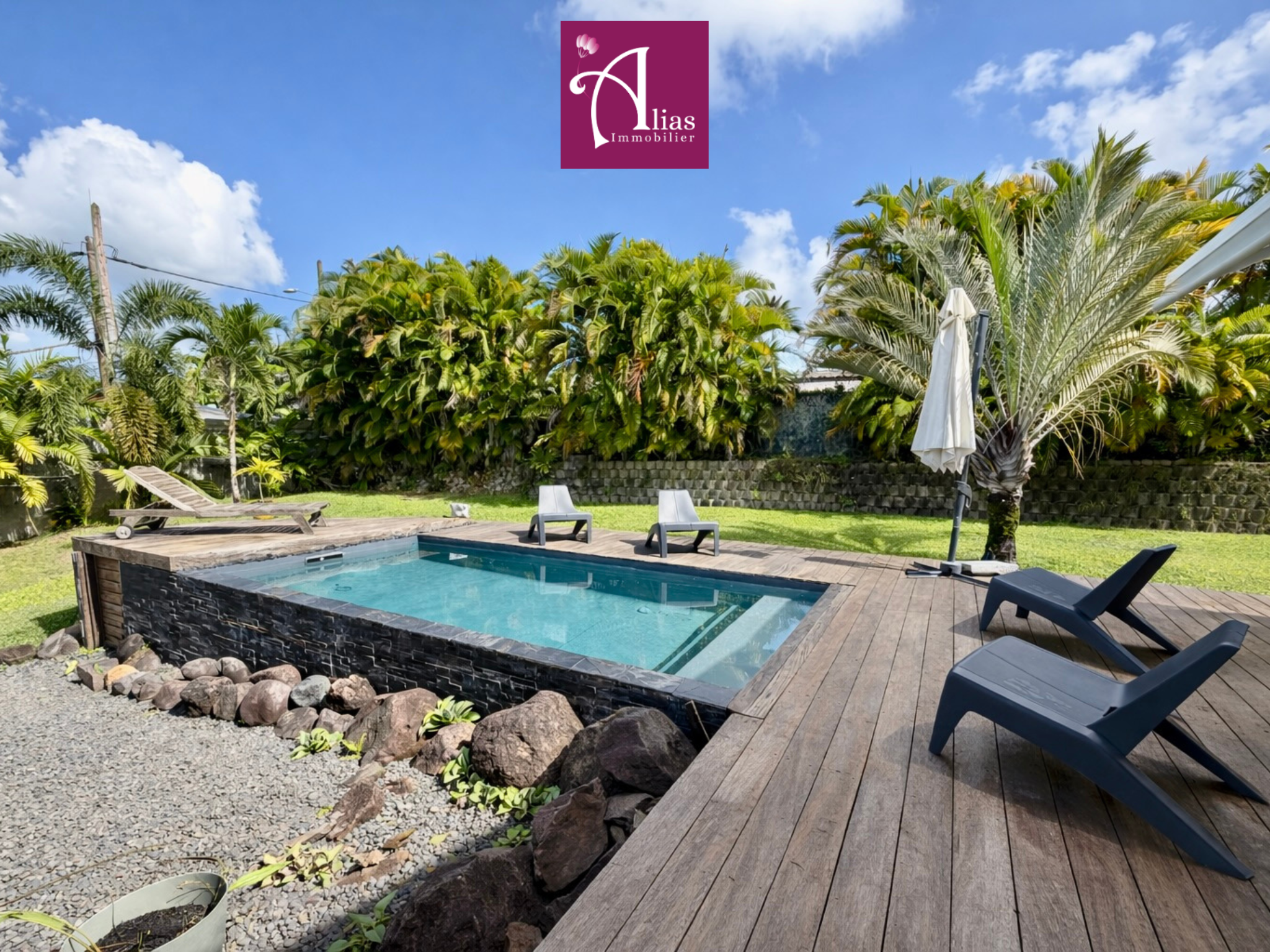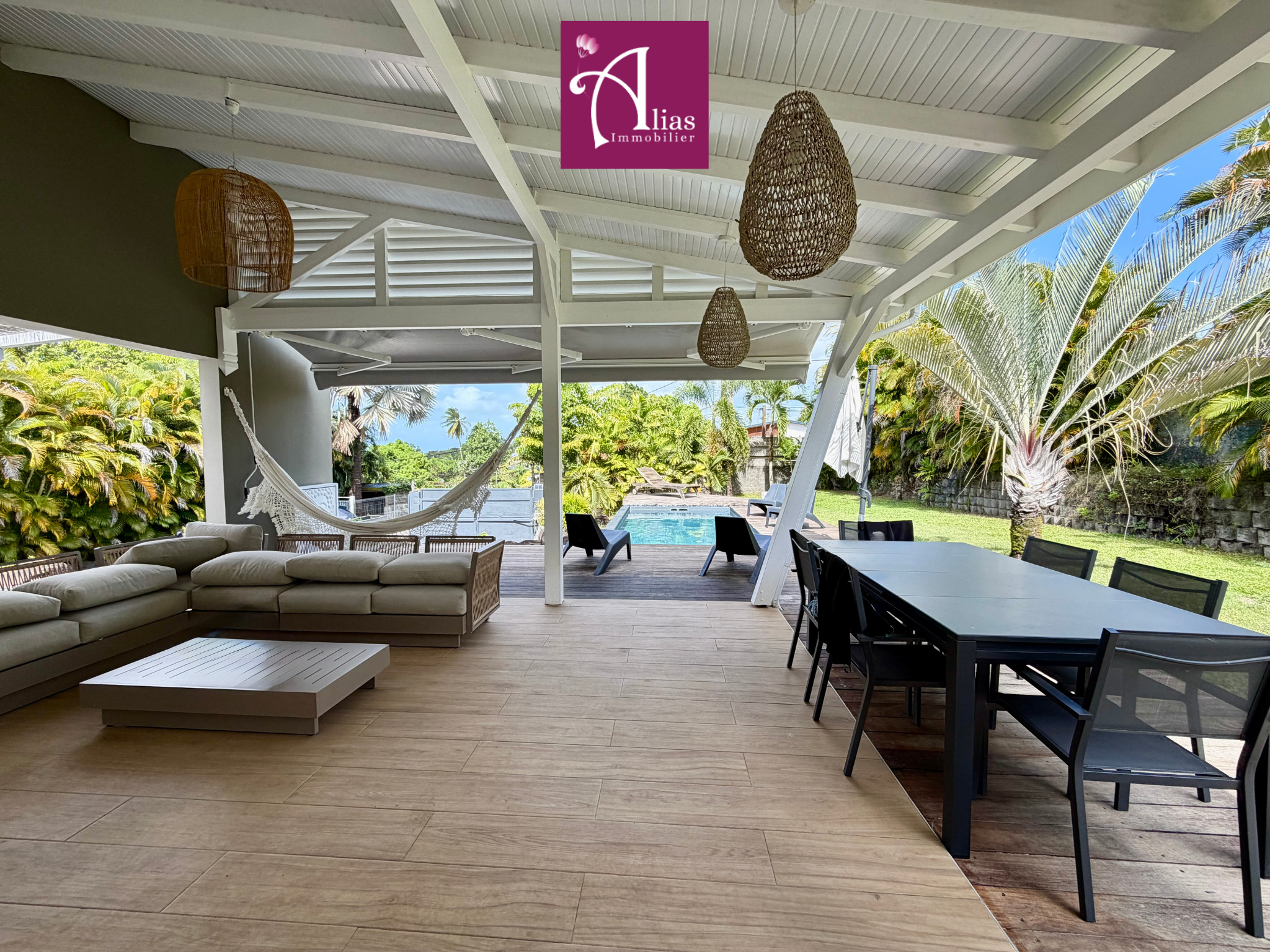 SUPERBE VILLA À LOUER À LA CARAPA Nous vous proposons à la location, cette sublime Villa T5 indépendante sur un terrain arboré et fleuri de 5000 m2, celle-ci est composée d 'un séjour de plus de 50m2, d'une suite parentale climatisée avec SDB, WC...