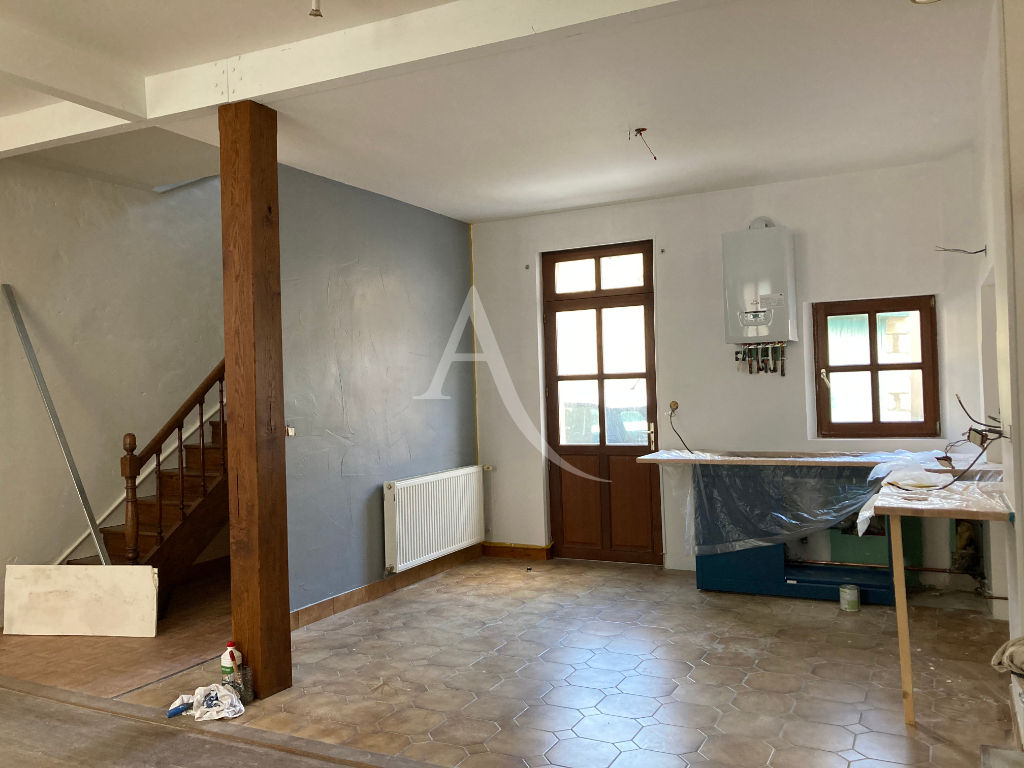 Offrant : séjour/salon avec cuisine aménagée/équipée (plaque de cuisson + four), wc et à l'étage : 2 chambres et salle de bains/wc.