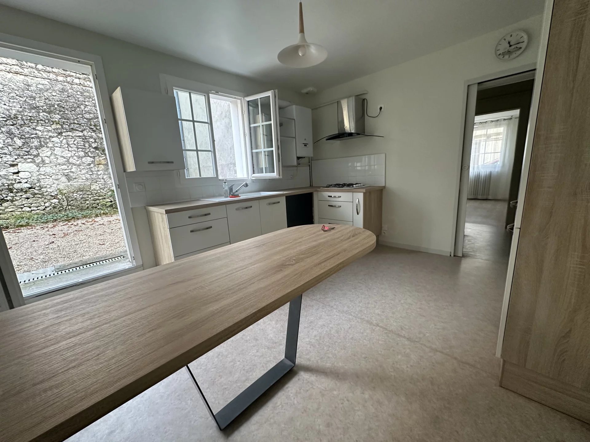 Côté Immo Location vous propose à la location cette charmante maison de plain-pied. Elle se compose d’un grand salon-séjour ouvert sur une cuisine de 37 m², équipée d’un four, d’une plaque de cuisson et d’une hotte aspirante.