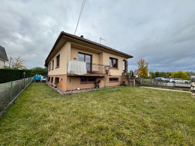 Pavillon de plain-pied situé Wittisheim, Rue du Stade, d'une surface habitable de 107,82m2, comprenant une entrée/dégagement avec placard, une cuisine aménagée avec coin repas, un salon/séjour, trois chambres, une salle d'eau aménagée, un WC séparé, ...