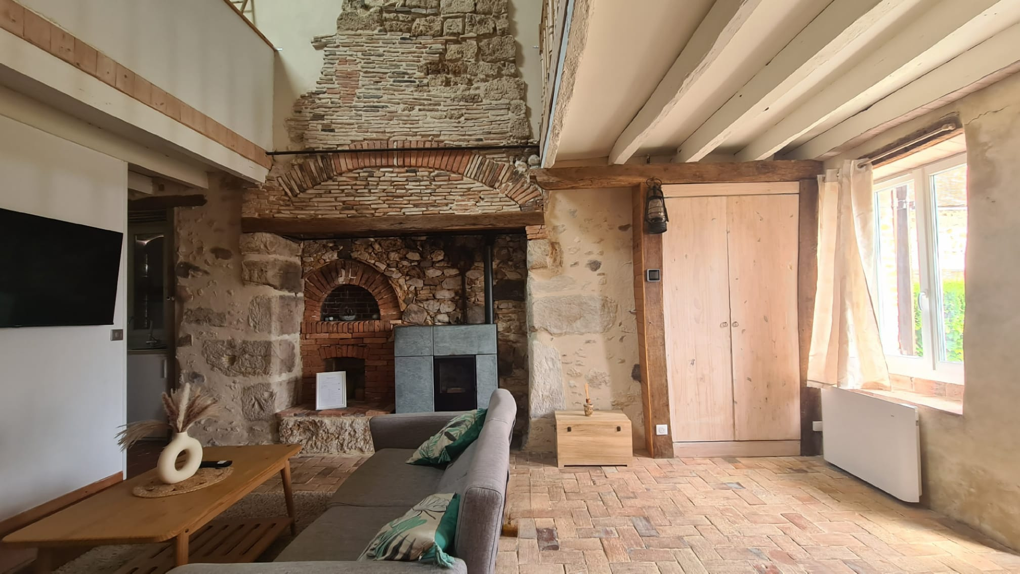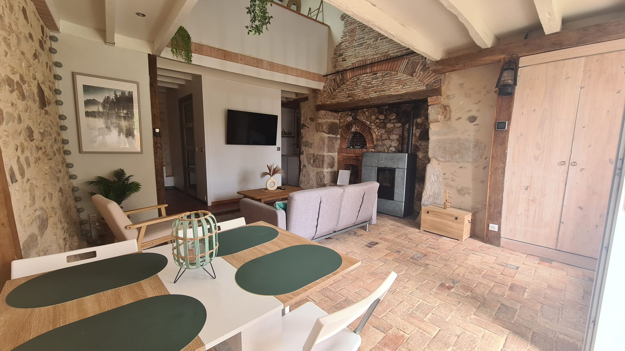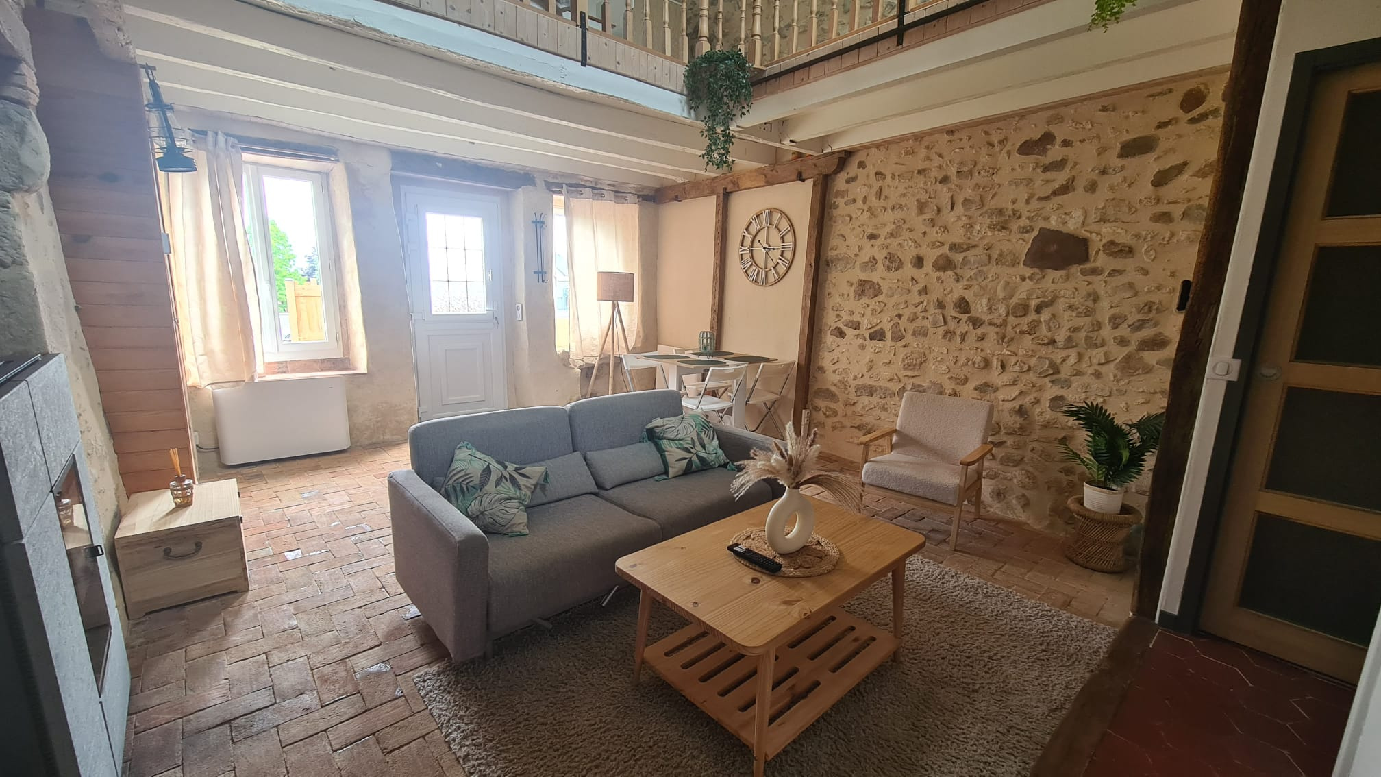Cette maison de charme de 51m2, entièrement meublée, offre une pièce de vie lumineuse avec poêle à granulés, une cuisine équipée, une salle d'eau et un WC. En mezzanine, une salle de bain en suite (espace nuit avec spa).