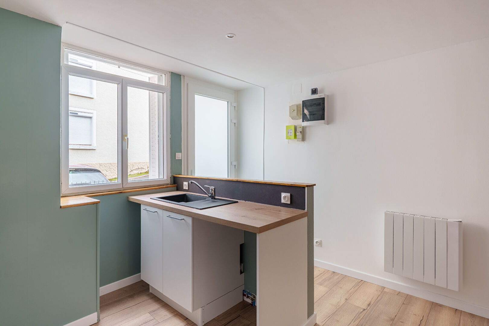 - Cuisine : sol parquet flottant, évier sur meuble, meubles bas,