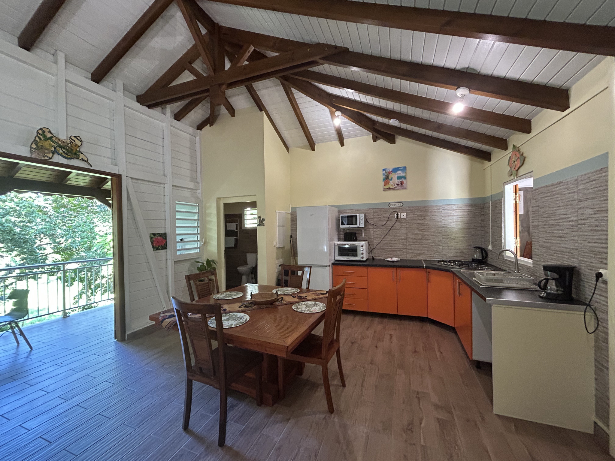 Elle se compose de 3 pièces, avec 1 chambre climatisée et une mezzanine pouvant faire office de seconde chambre, bureau ou espace détente.
