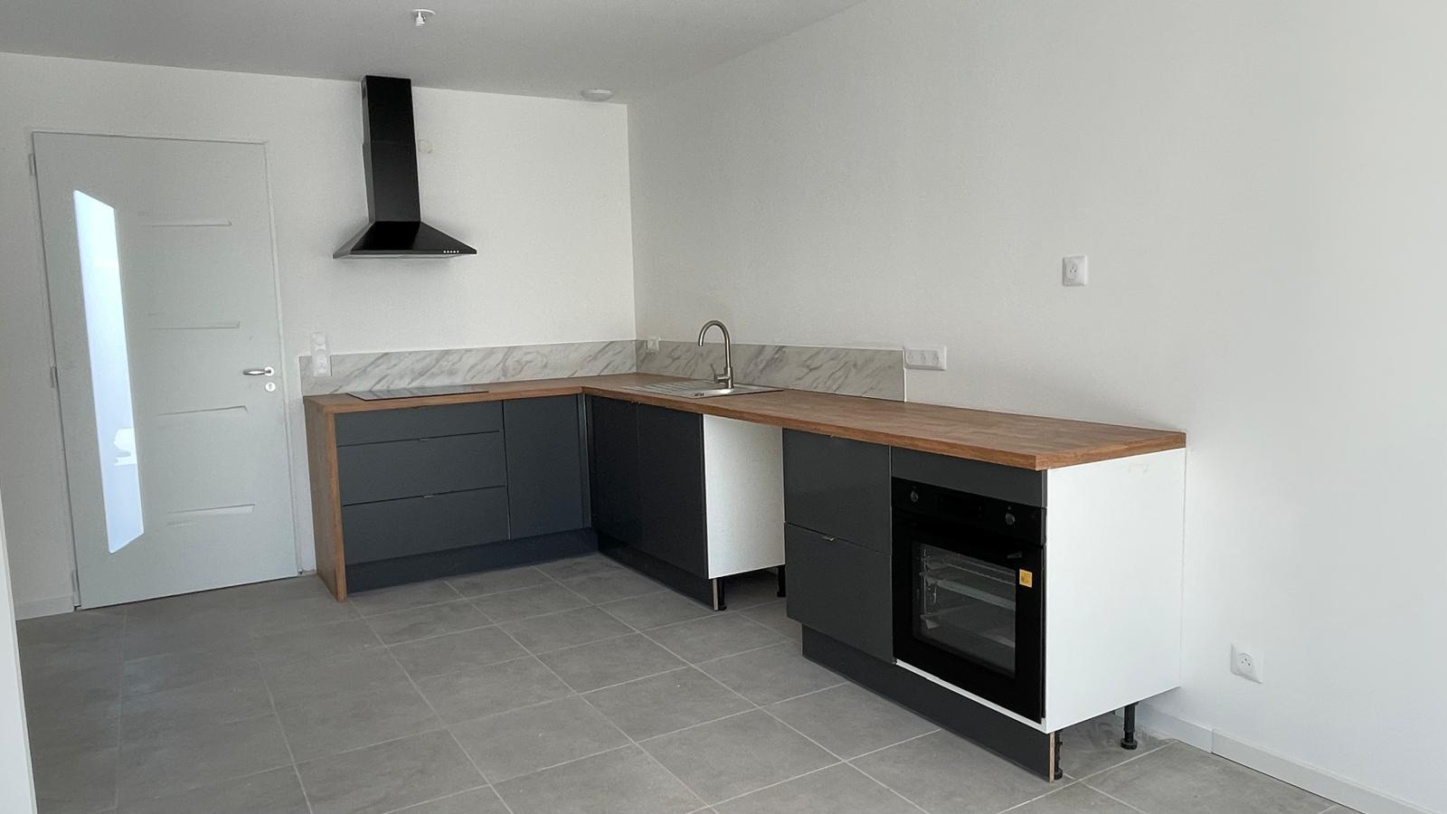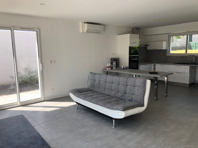 Séjour, cuisine ouverte aménagée et équipée, cellier, WC, 3 chambres avec placards, salle d'eau avec WC et un garage. Terrain de 526m². Disponible début Février.
