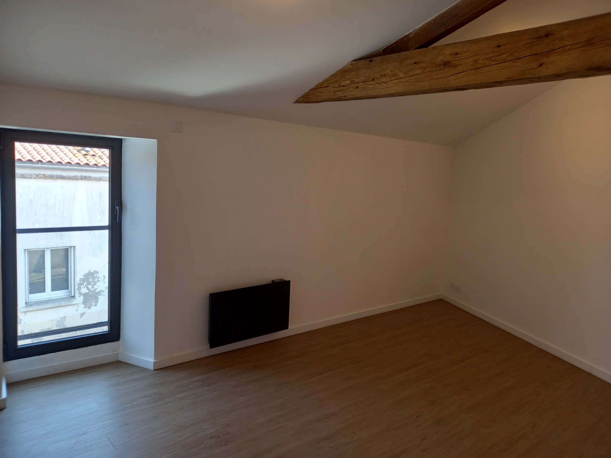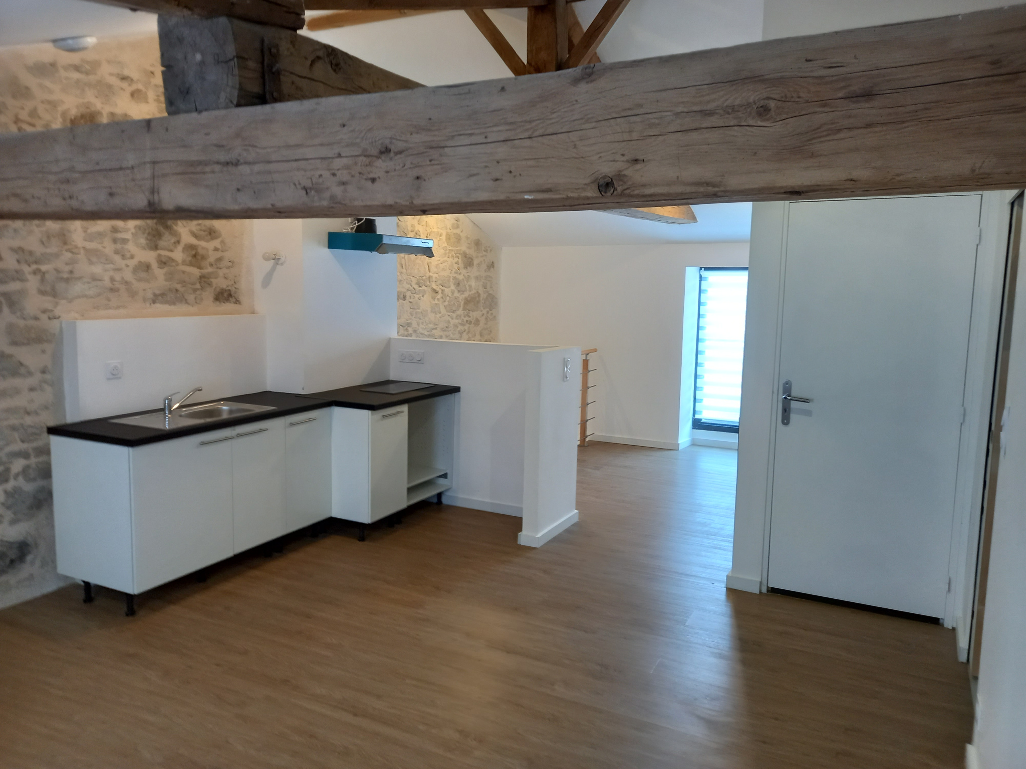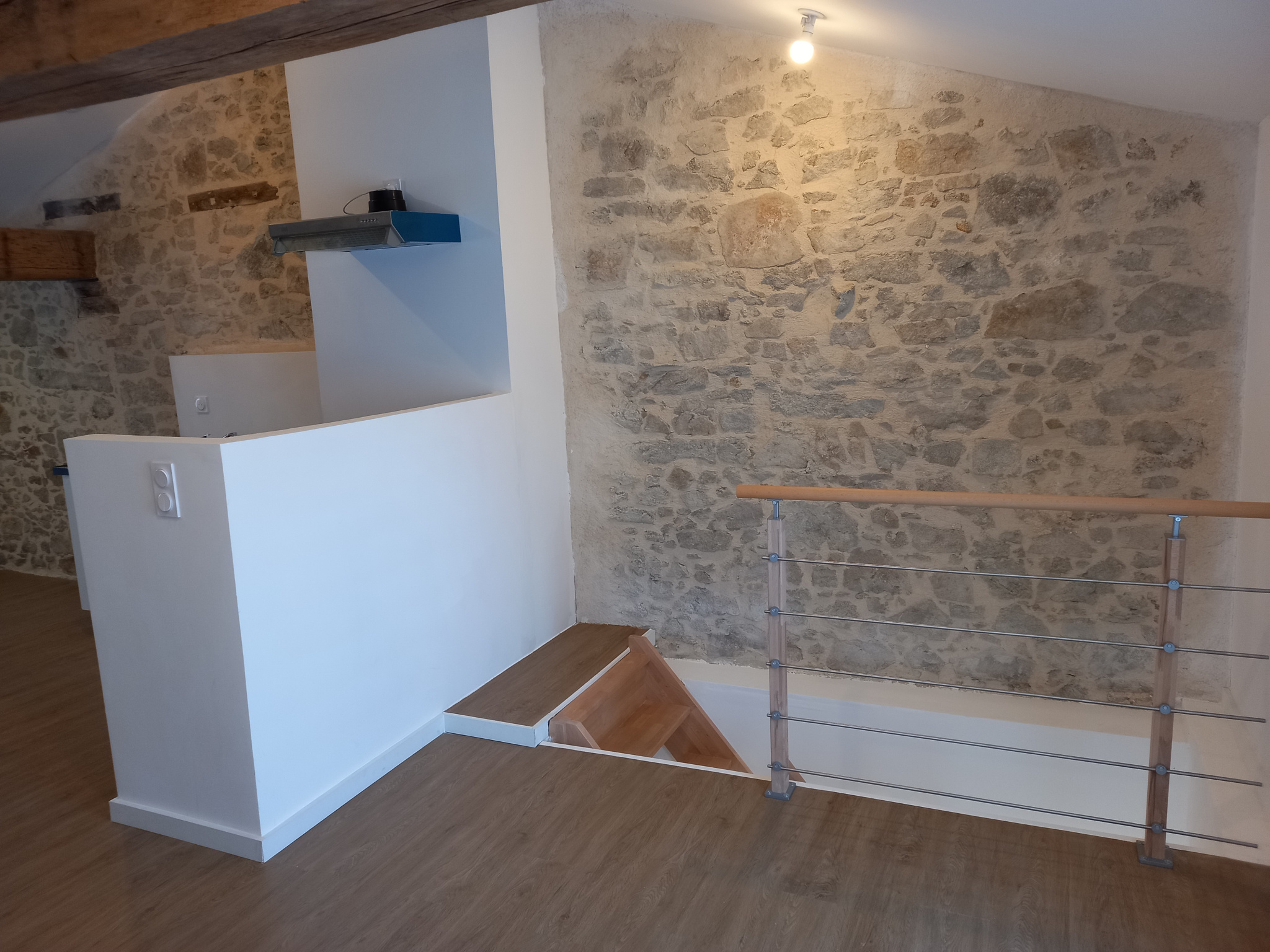 Située au coeur du bourg, appartement sur deux niveaux comprenant dans la partie habitation située à l'étage : un espace séjour de 32 m2 comprenant un coin cuisine semi équipée (plaque à induction et hotte), wc, un coin li...