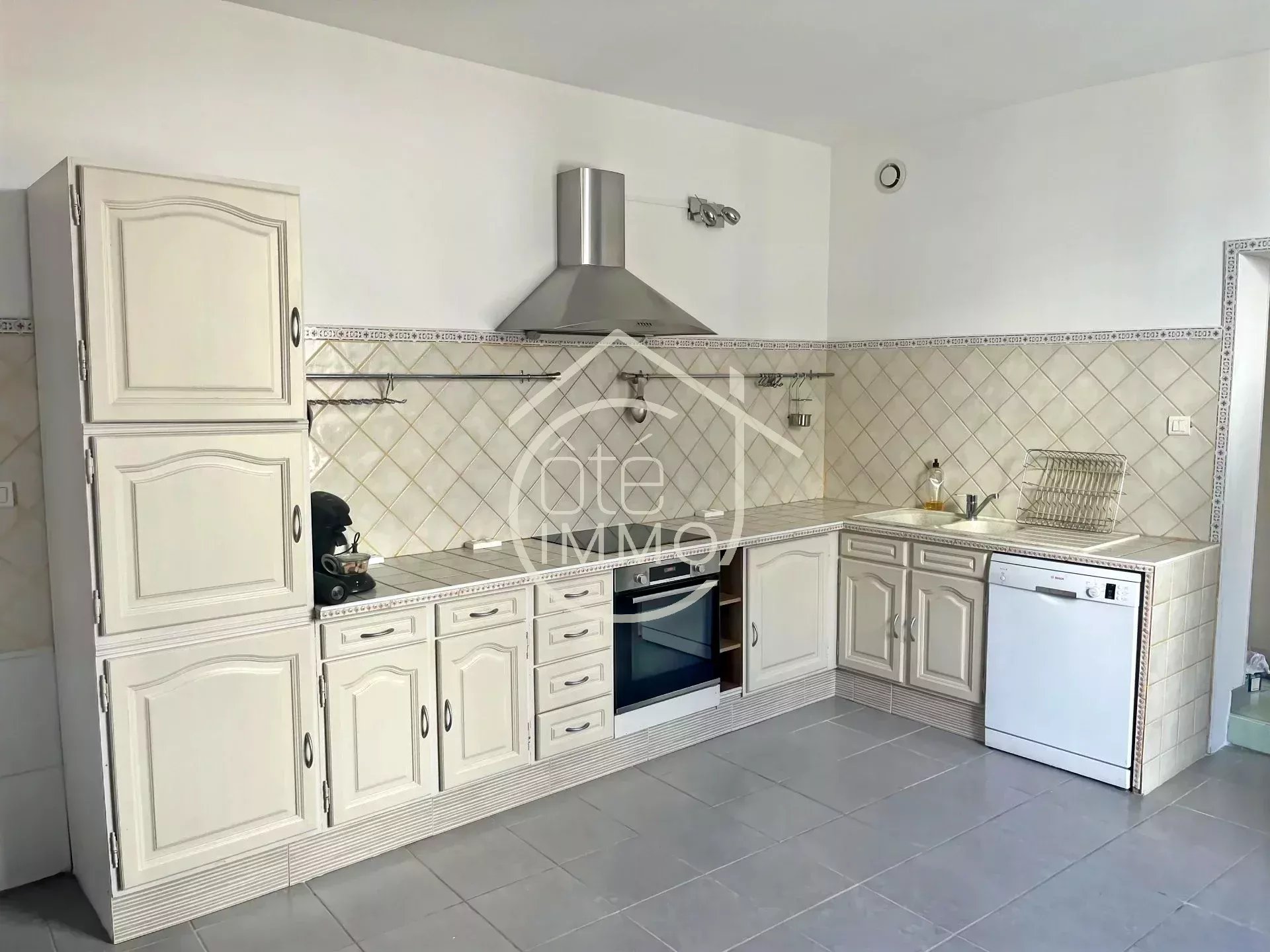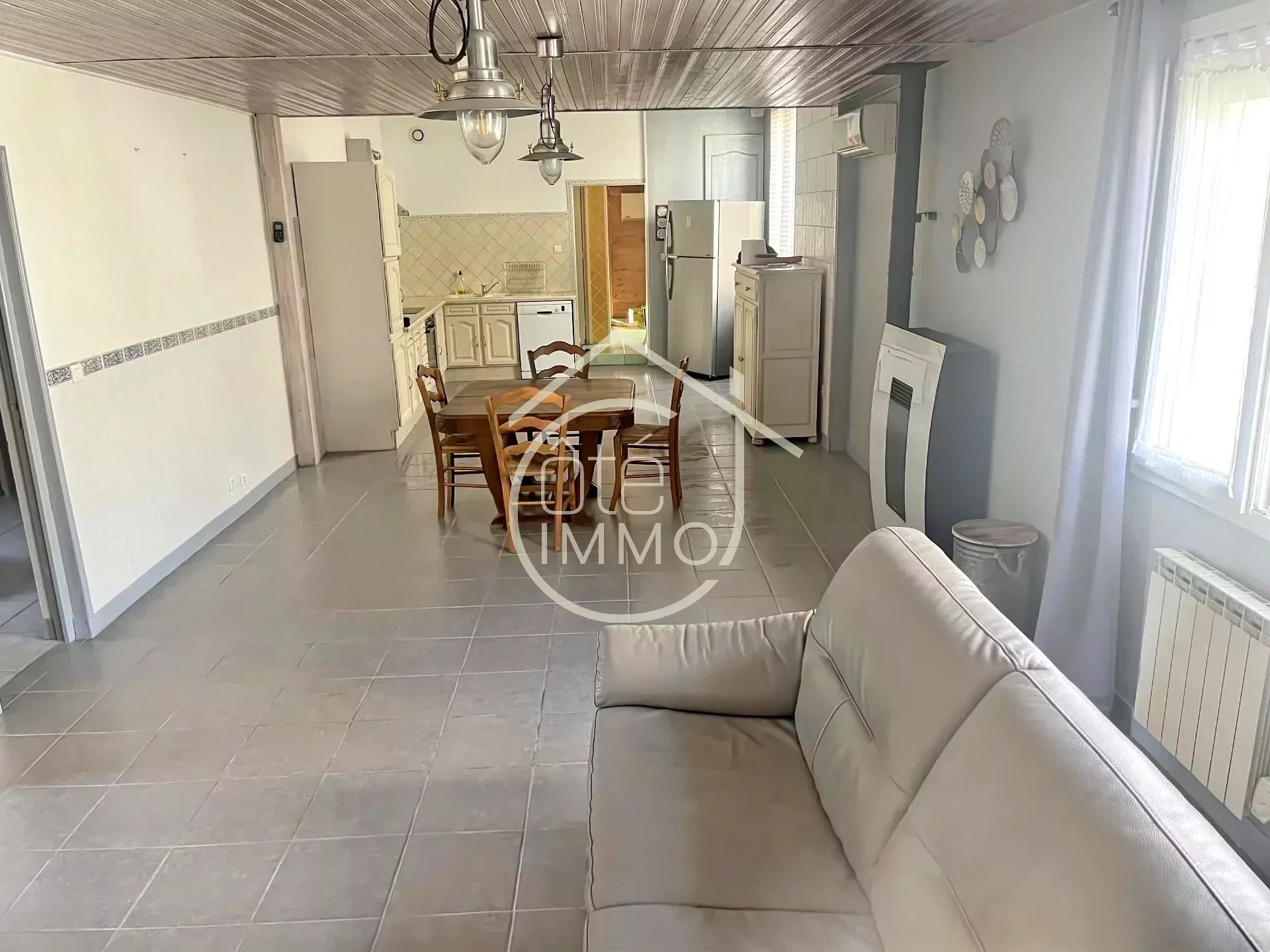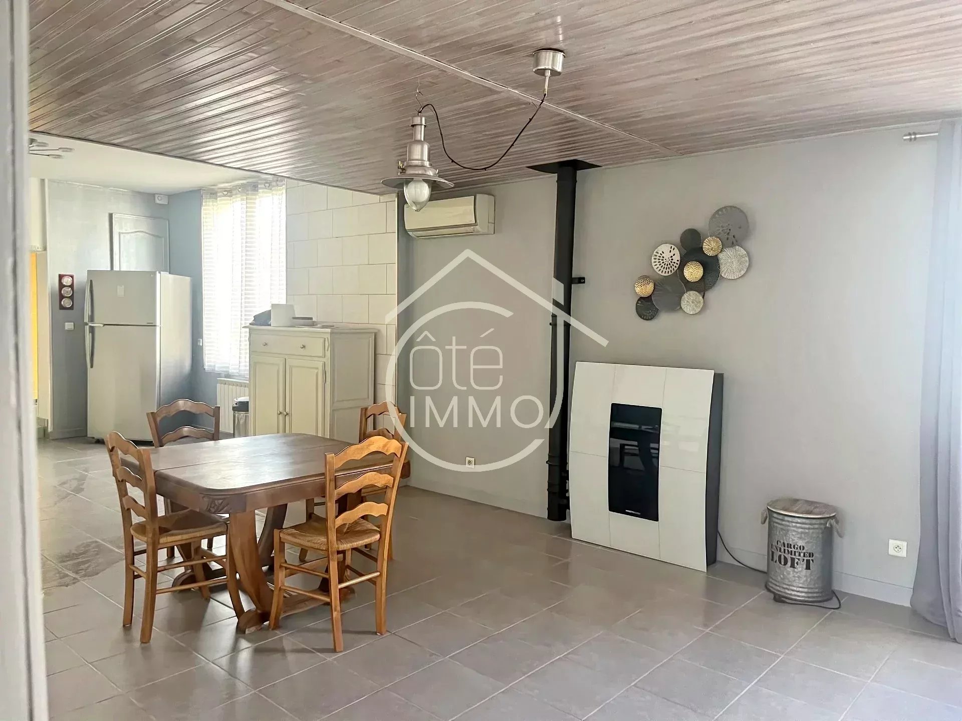 Cette maison entièrement rénovée comprend au rez-de-chaussée une pièce de vie, une cuisine aménagée et équipée, un cellier, une salle d'eau e...