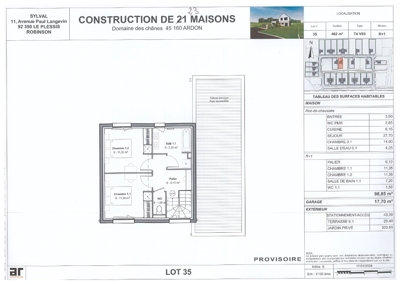 ARDON, proche bourg dans nouveau lotissement beau pavillon F4 comprenant : au RDC : une entrée avec placard, un séjour avec cuisine aménagée et équipée (hotte + plaques), un wc, une suite parentale avec dressing et salle d'eau. A l'étage : un palier...