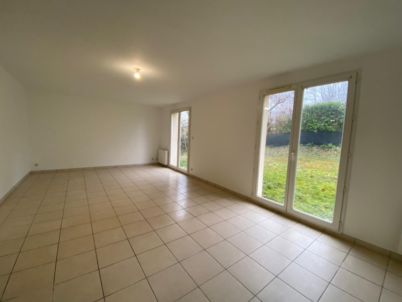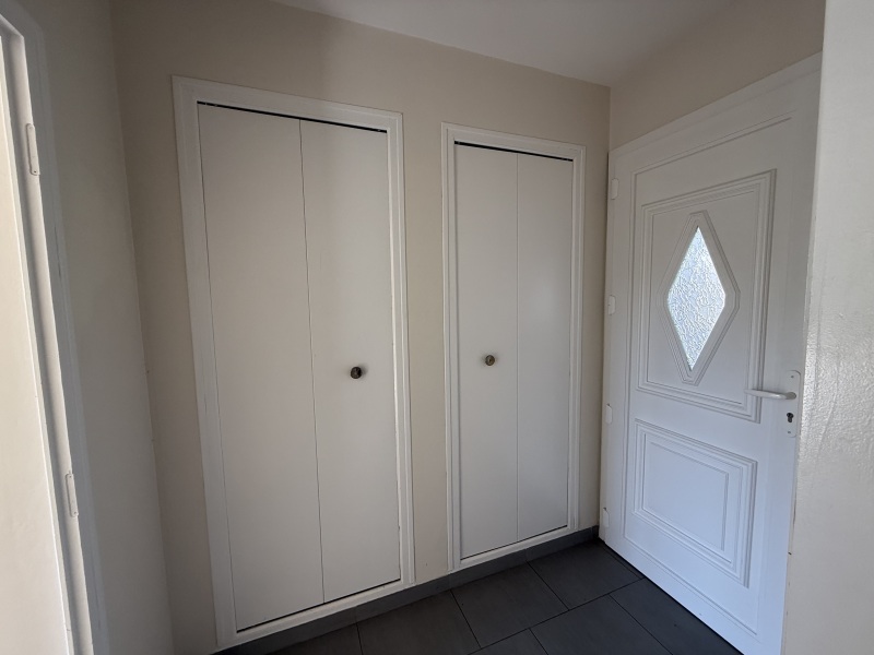Entrée sur salon avec grand placard, salon lumineux ouvrant sur le jardin.