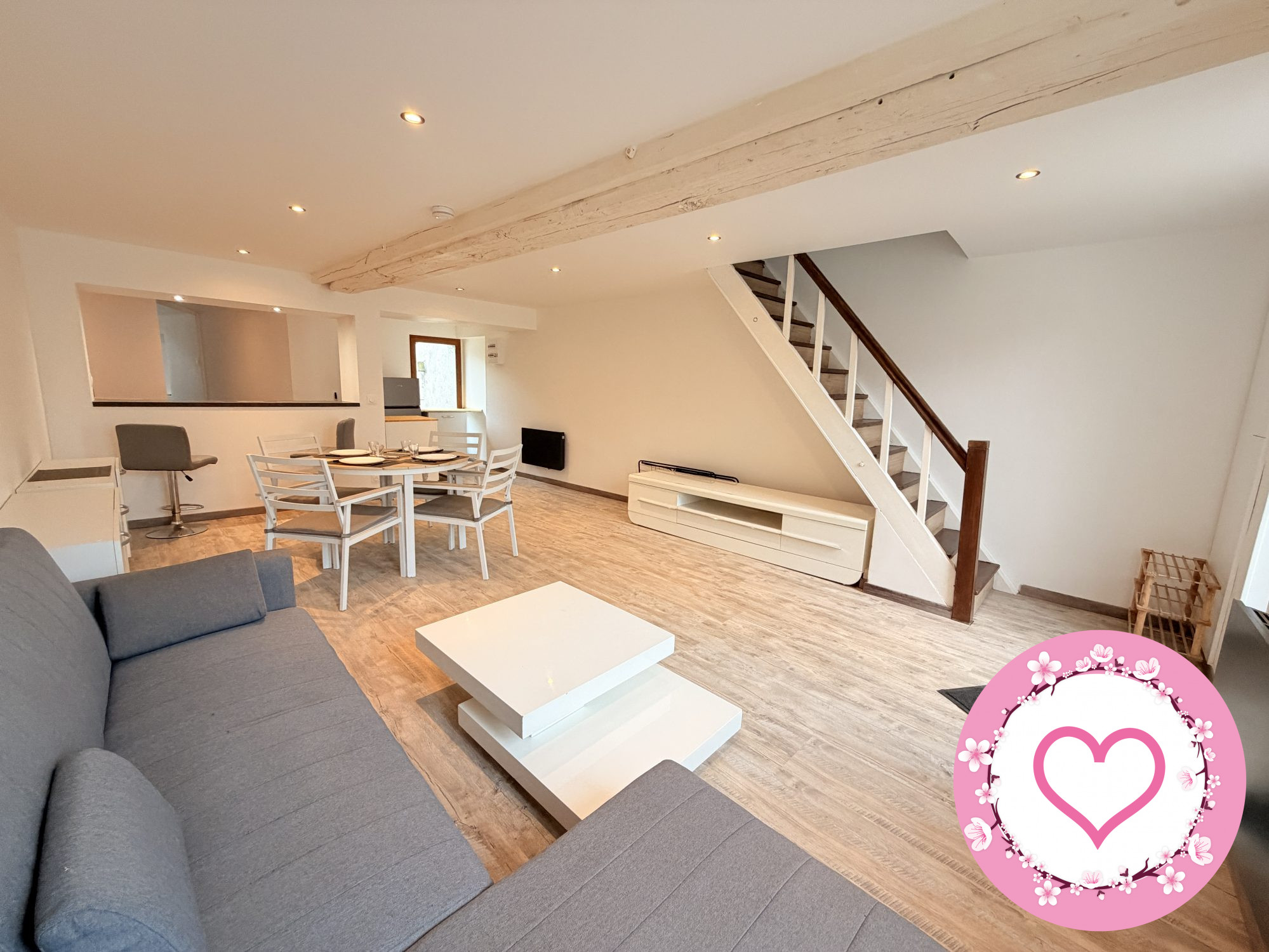 Entièrement meublée avec 3 chambres, un beau séjour ouvert et une cuisine aménagée et équipée.