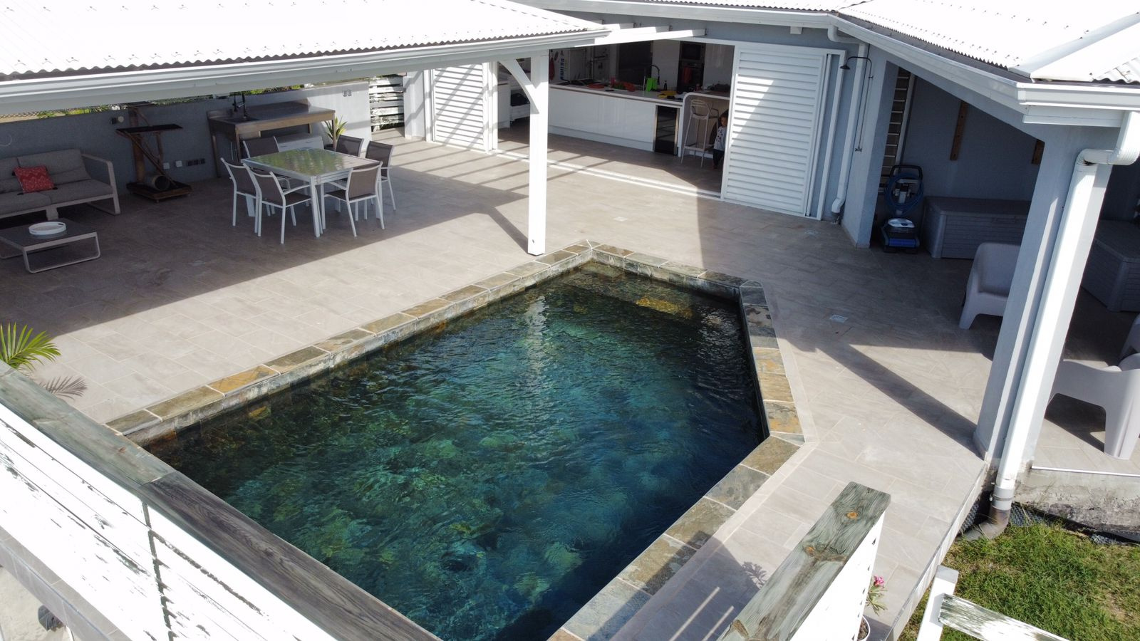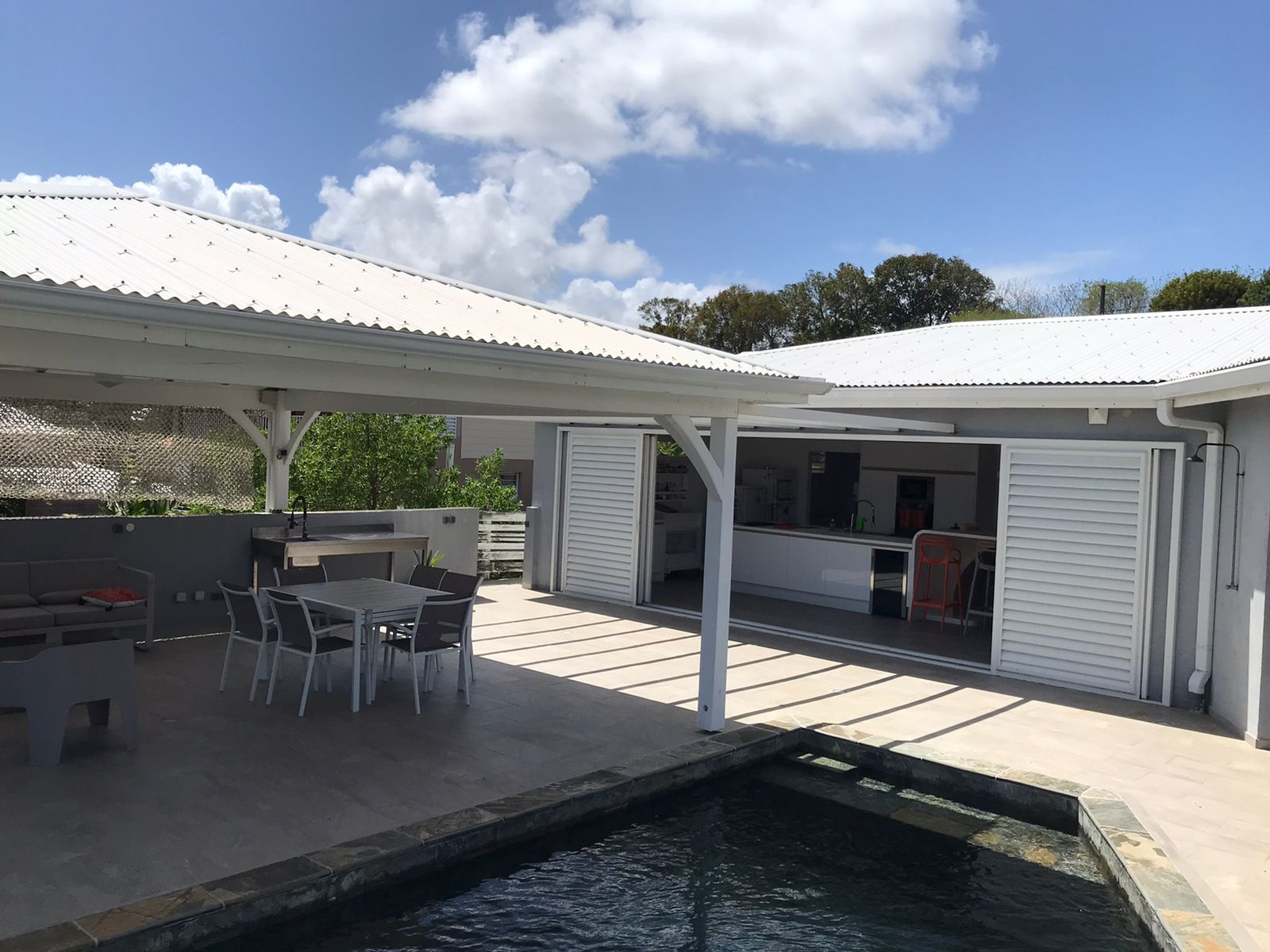 LE VAUCLIN : Située dans lotissement sécurisé, charmante villa F4 de plain pied comprenant un grand salon, cuisine aménagée ouverte, buanderie. Trois chambres avec espace de rangement et climatisées, deux salles d'eau. Belle terrasse à vivre avec piscine ...