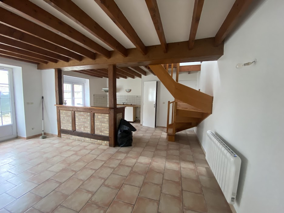 Maison F3 de 60.25m2 habitables environ comprenant : Séjour avec coin-cuisine, wc. A l'étage : palier, 2 chambres, salle de bains avec wc. Cellier. Parking 1 voiture, courette sur environ 80m2. Box individuel fermé dans grange.