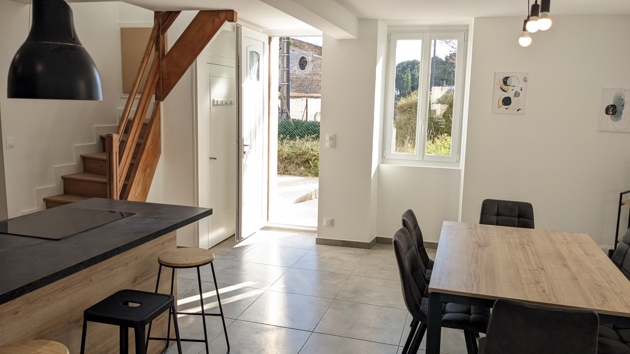 A 5 minutes à pied de la place de la brèche, cette charmante maison de ville meublée offre entrée sur la cuisine qui est aménagée et équipée avec plaque, hotte, four, réfrigérateur, lave linge.