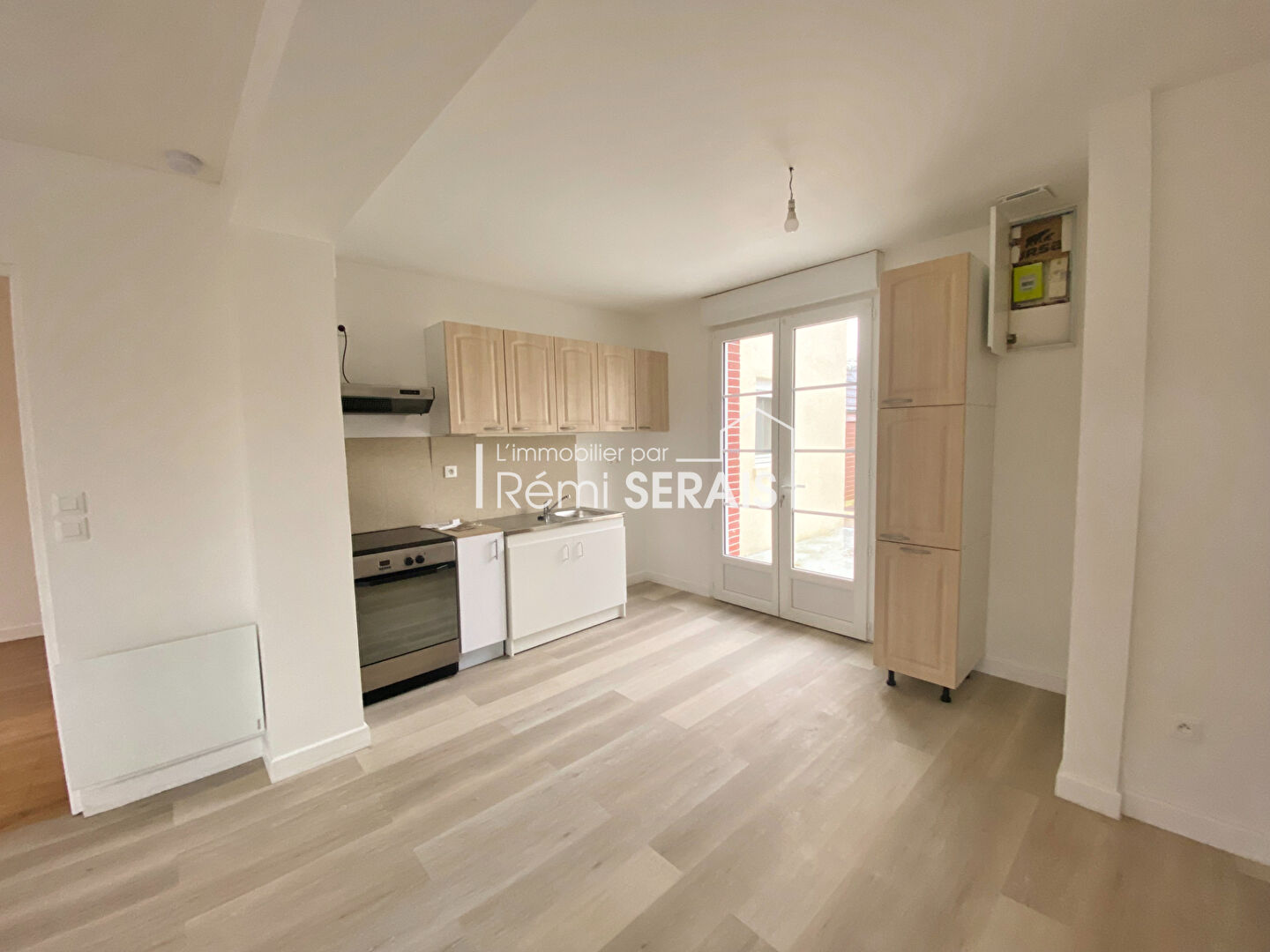POSES au coeur du village, au calme, maison jumelée, de type F2 de 51m², très lumineuse, comprenant entrée sur sèjour avec cuisine ouverte aménagée, chambre, salle de douche avec WC. Petit exterieur avec espace terrasse Libre le 8 Novembre