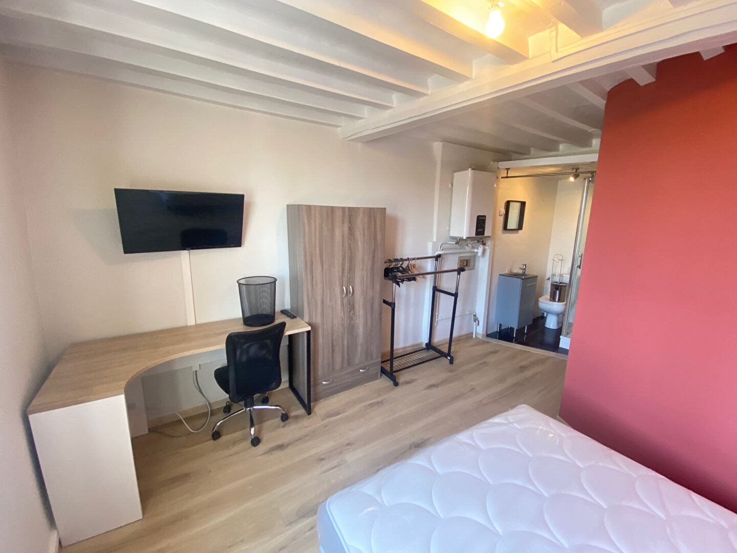 Elle dispose également d'un lit, un grand placard, un bureau et une chaise