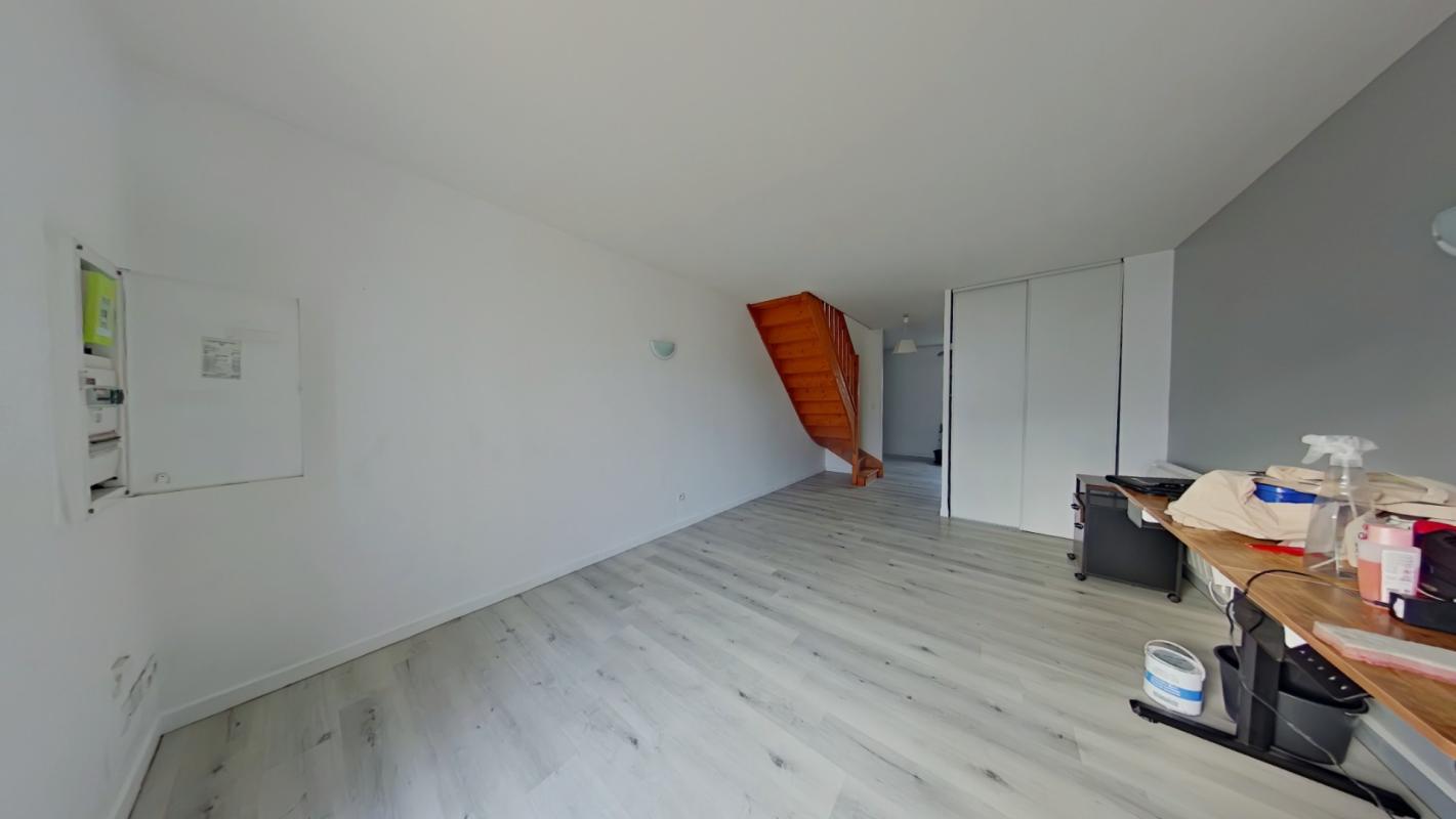 Marmande, maison T3 avec terrasse et jardin, comprenant au rez-de-chausée : séjour ouvert sur coin cuisine, dégagement, salle d'eau, wc, et à l'étage : deux chambres et bureau. Garage. Disponible. Chauffage électrique.
