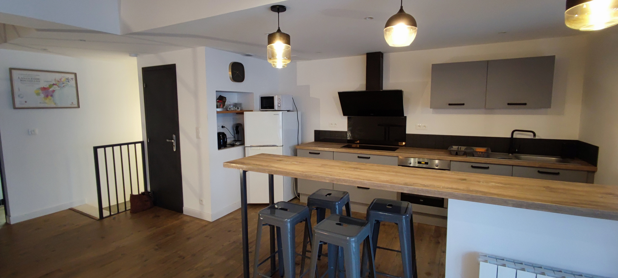 Cuisine aménagée ouverte sur séjour, équipée de plaque de cuisson gaz et hotte, wc séparé et salle de bain à l'étage.