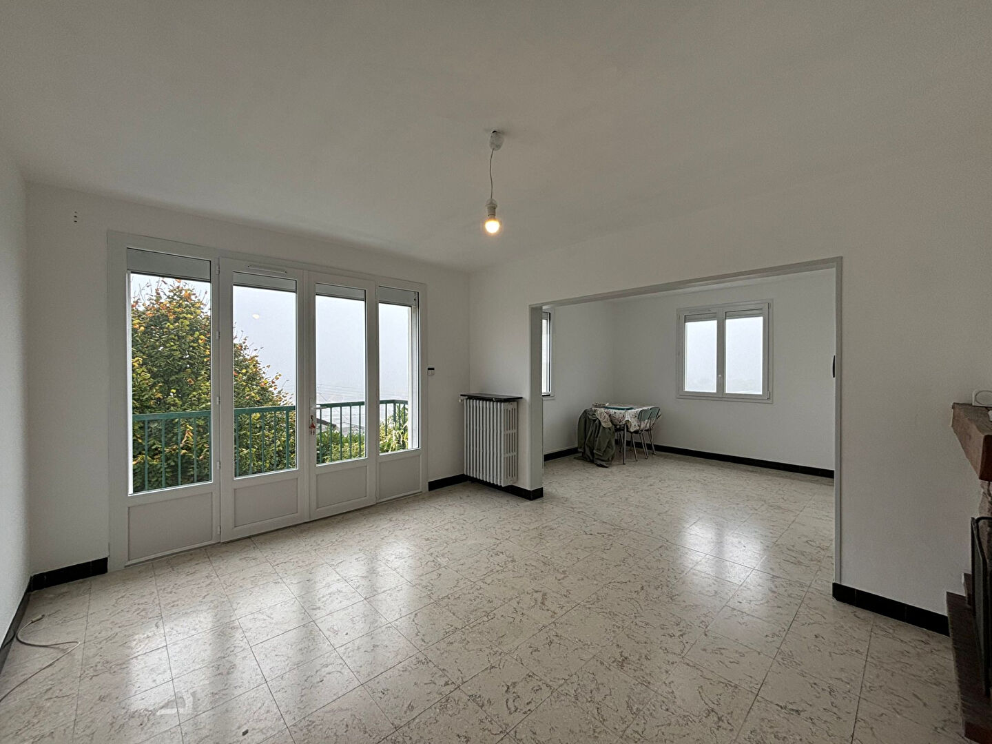 Entrée avec placards, WC, cuisine aménagée et équipée (plaque gaz, hotte), salle à manger et séjour ouvrant sur balcon. Dégagement avec placard, trois chambres et salle d'eau.