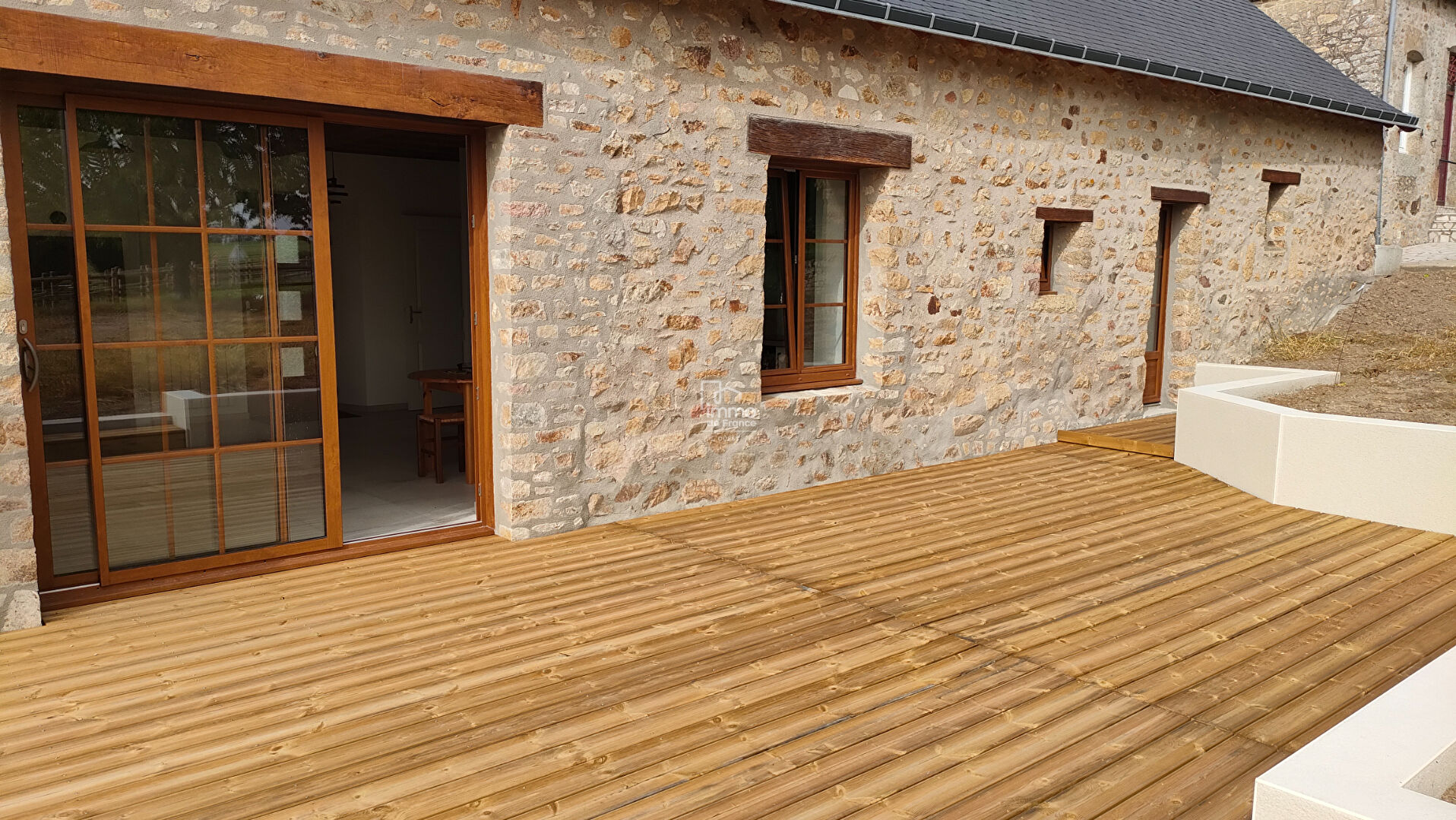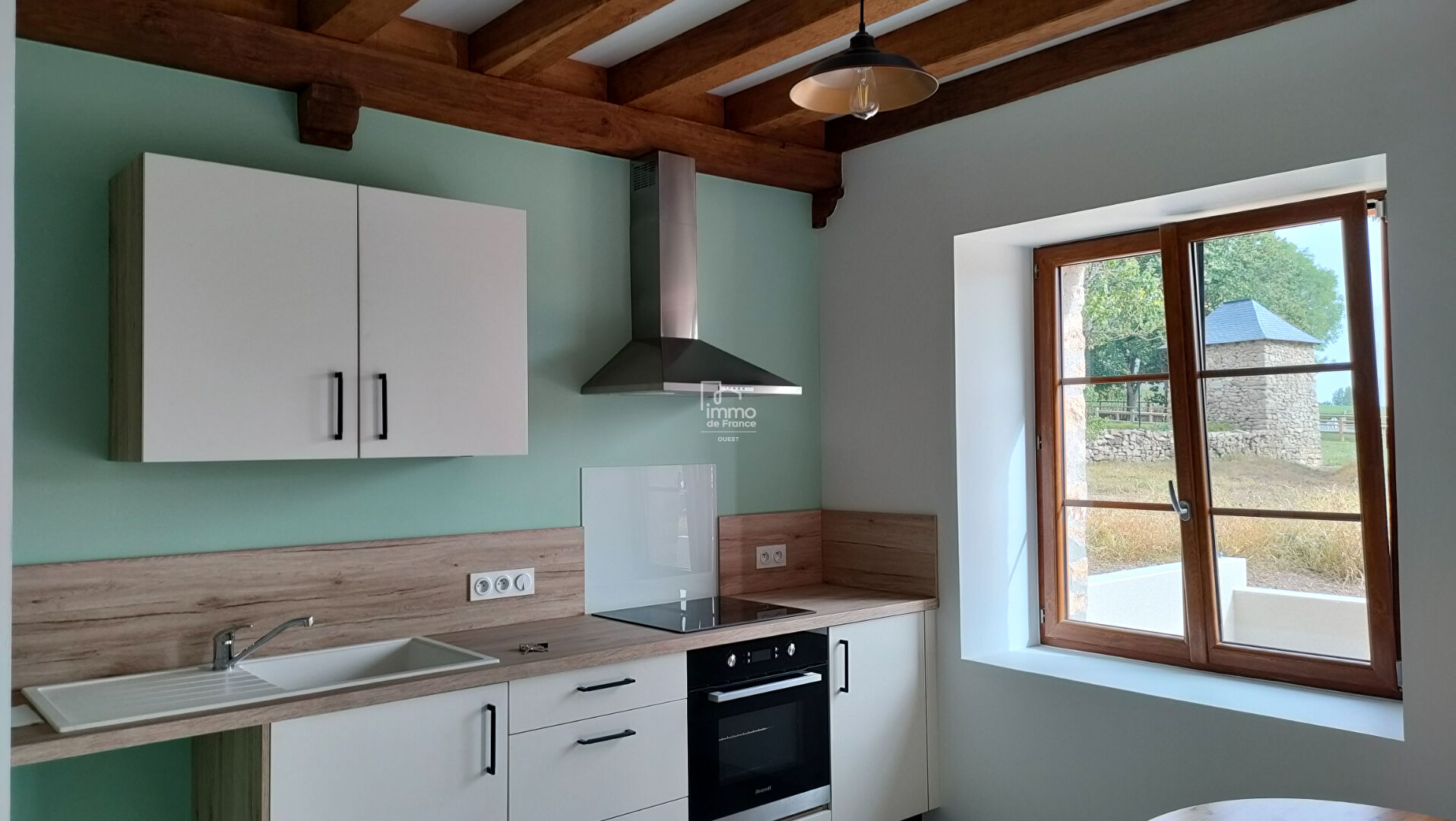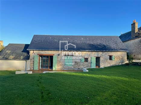 013-06 L E6415 ST OUEN DES VALLONS, sortie de village belle maison en pierres entièrement rénovée comprenant cuisine équipée ( hotte, plaques, four ), salle d'eau, buanderie, 2 chambres , garage, grenier terrasse et terrain.