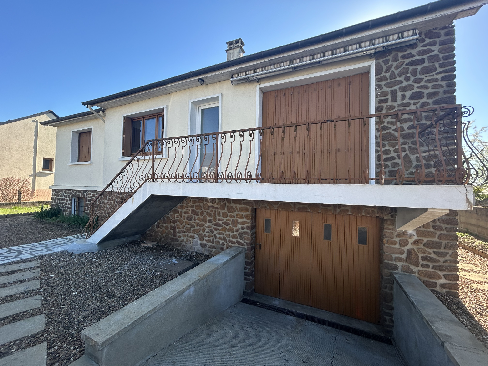 Maison de type 4 de plain pied comprenant: entrée, salon séjour avec cheminée, cuisine, trois chambres, salle d'eau avec WC, arrière cuisine et cellier. Garage double, jardin clos et arboré.