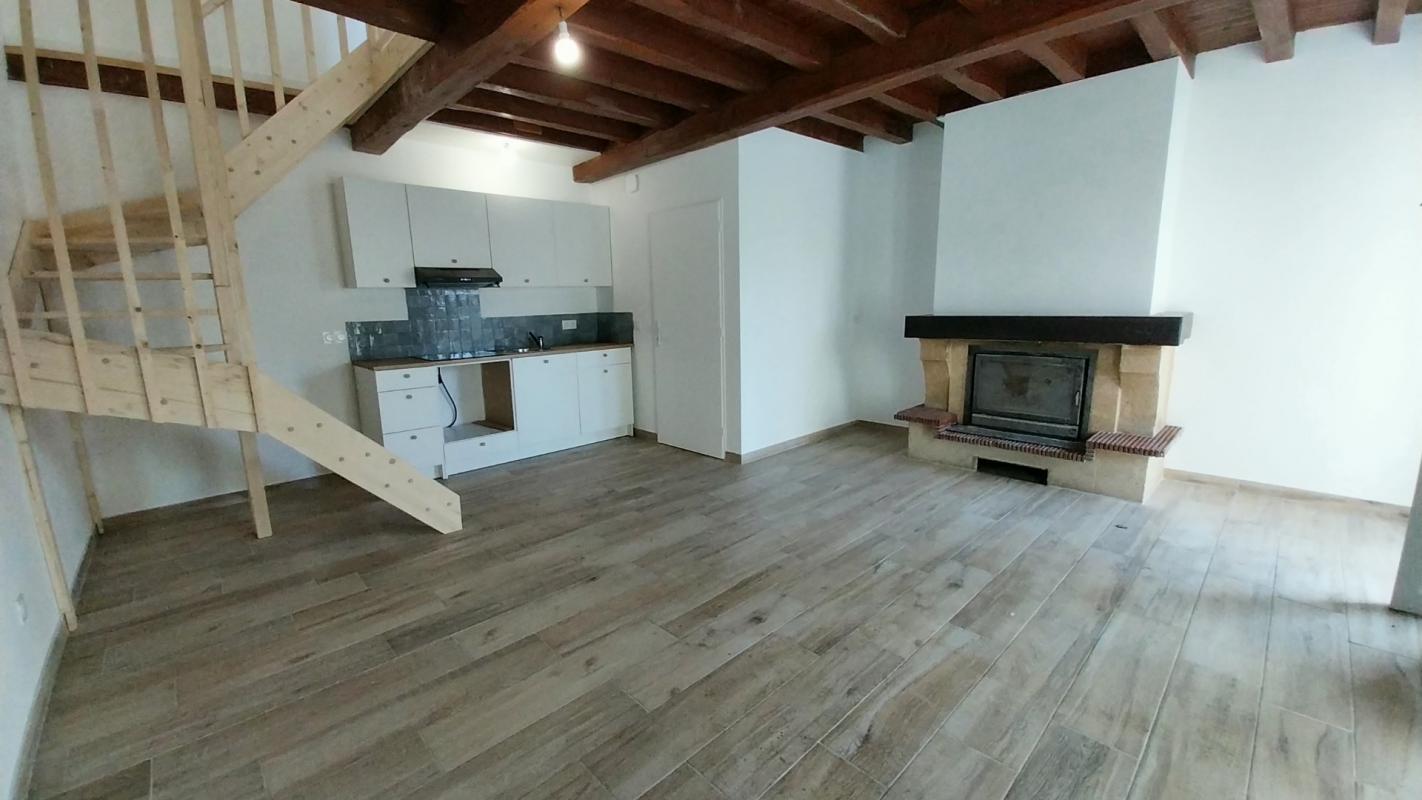 Maison rénovée entièrement T3sur deux niveaux avec terrasse extérieure, composée d'un séjour, cuisine aménagée ouverte, deux chambres. Place de parking. Chauffage climatisation réversible.