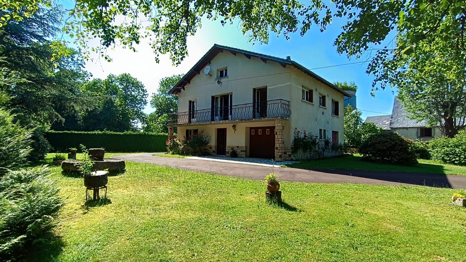 Sur un agréable terrain clos de 3000 m², maison 181.80 m² habitables avec beaux volumes, RDC : entrée, buanderie, 2 chambres, garage, WC. 1er ét. : 3 chambres, pièce de vie 30 m², balcon, cuisine équipée 15 m², SDB avec WC, Combles.