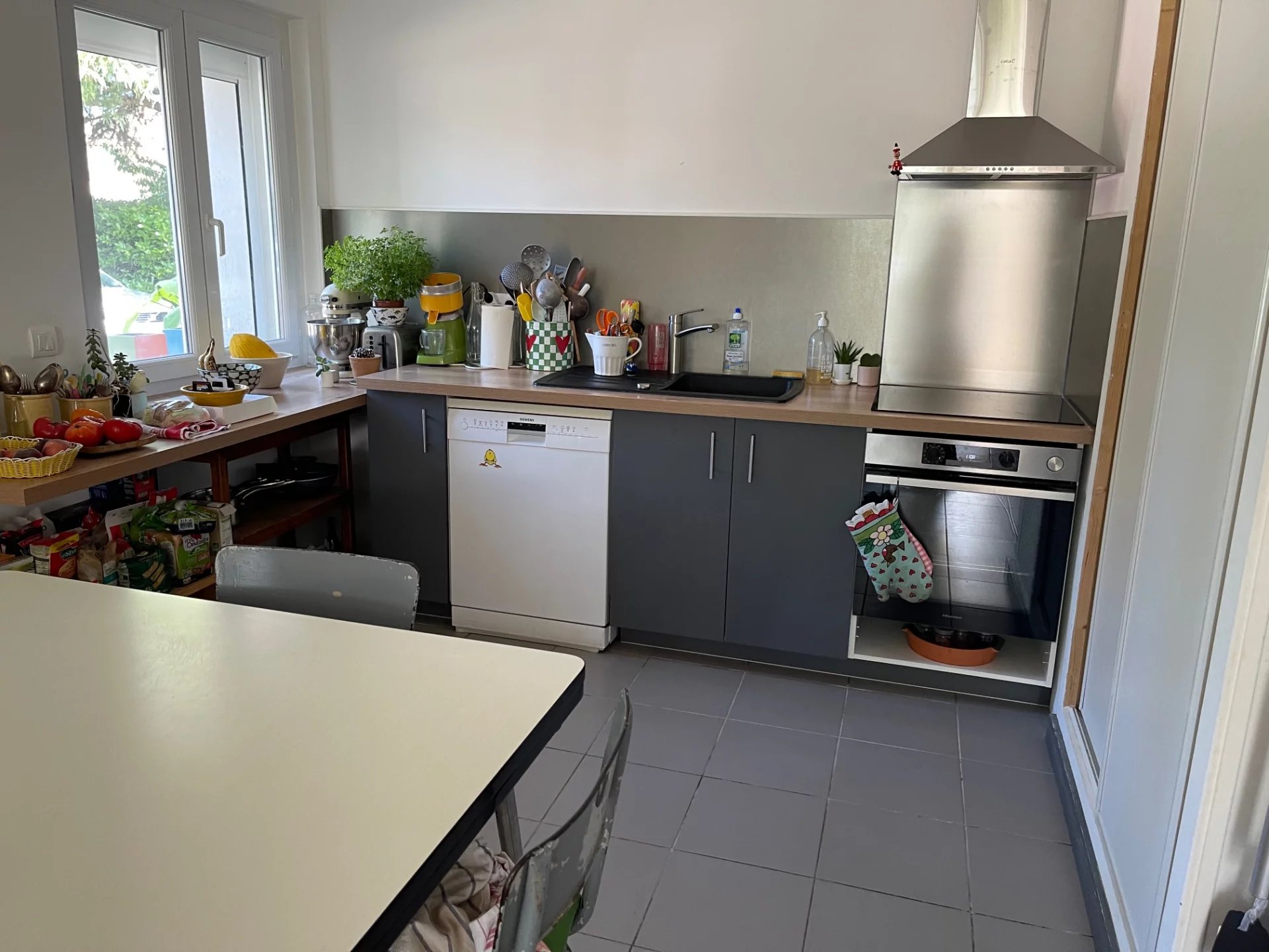 Partie de maison, T3, mitoyenneté non gênante, avec jardin clôturé de 500 m² et d'une surface totale de 76,74 m² et habitable de 67,44 m², dont un cellier avec évier de 9,30m² avant de rentrer dans la maison.