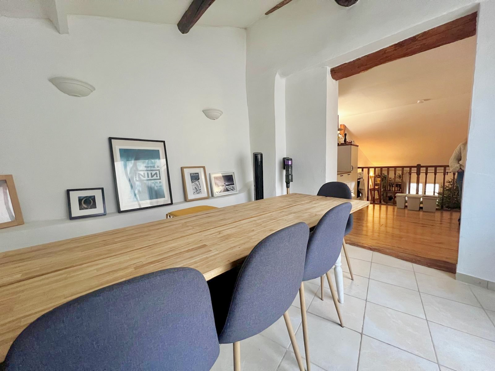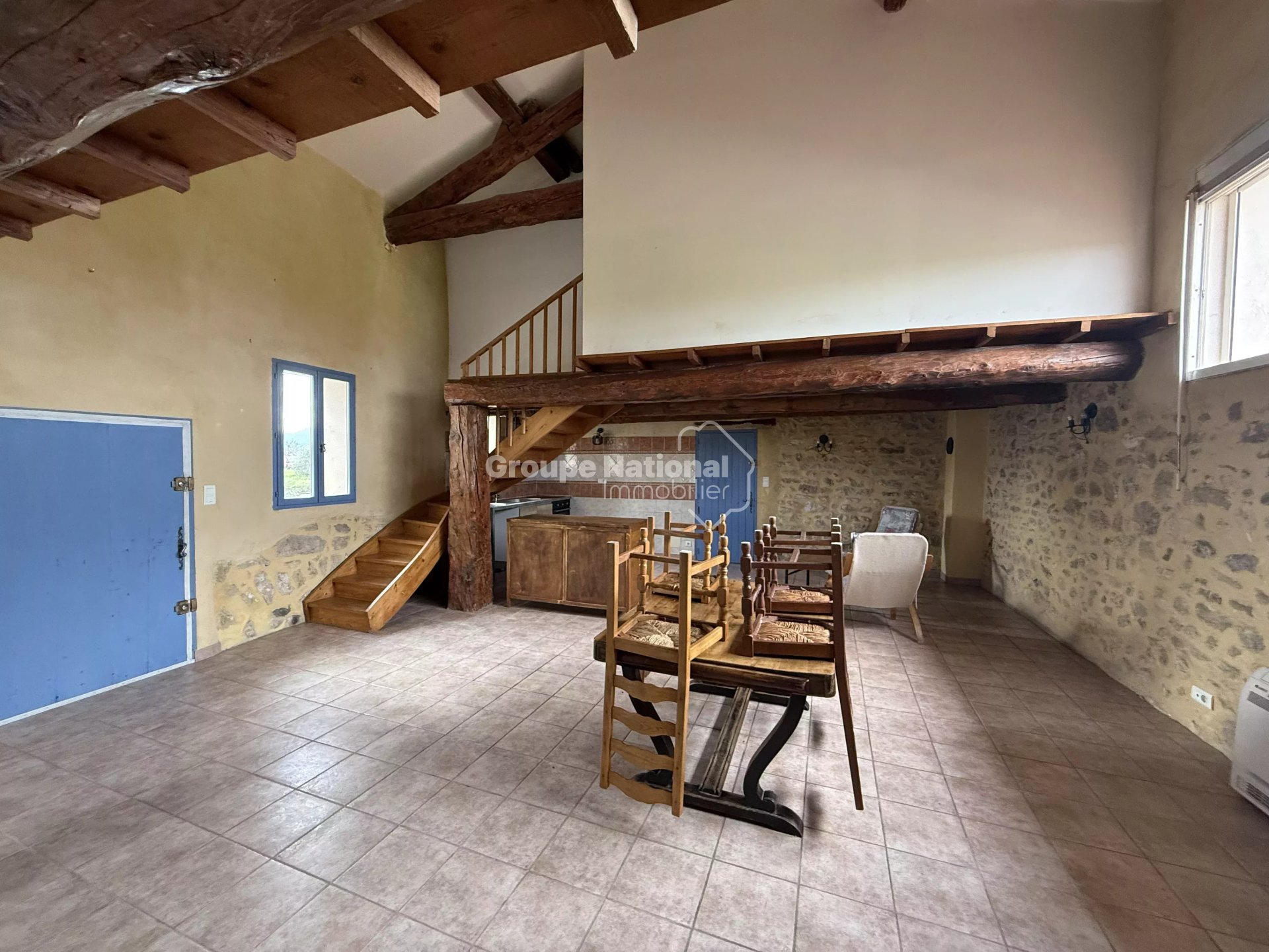 Au 1er étage, le logement se compose d'une salle à manger avec cuisine meublée, d'un salon de presque 20m2 ouvrant sur un ba...
