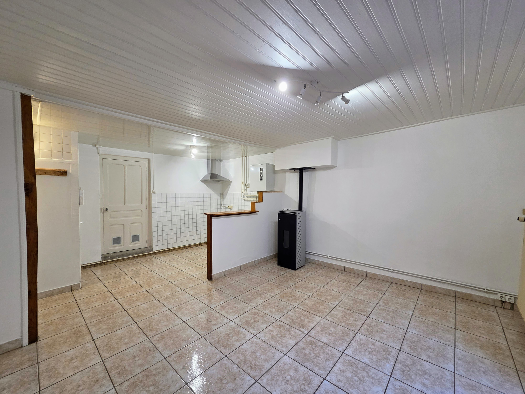 entrée, cuisine, séjour avec insert, salle de bains, wc,
