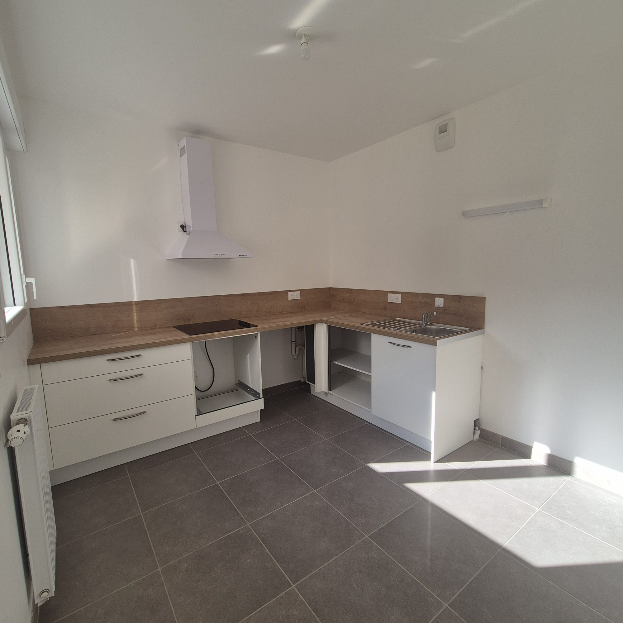 Une cuisine aménagée et équipée (plaques, hottes, frigo, micro-onde, four), une salle d'eau, une loggia avec...