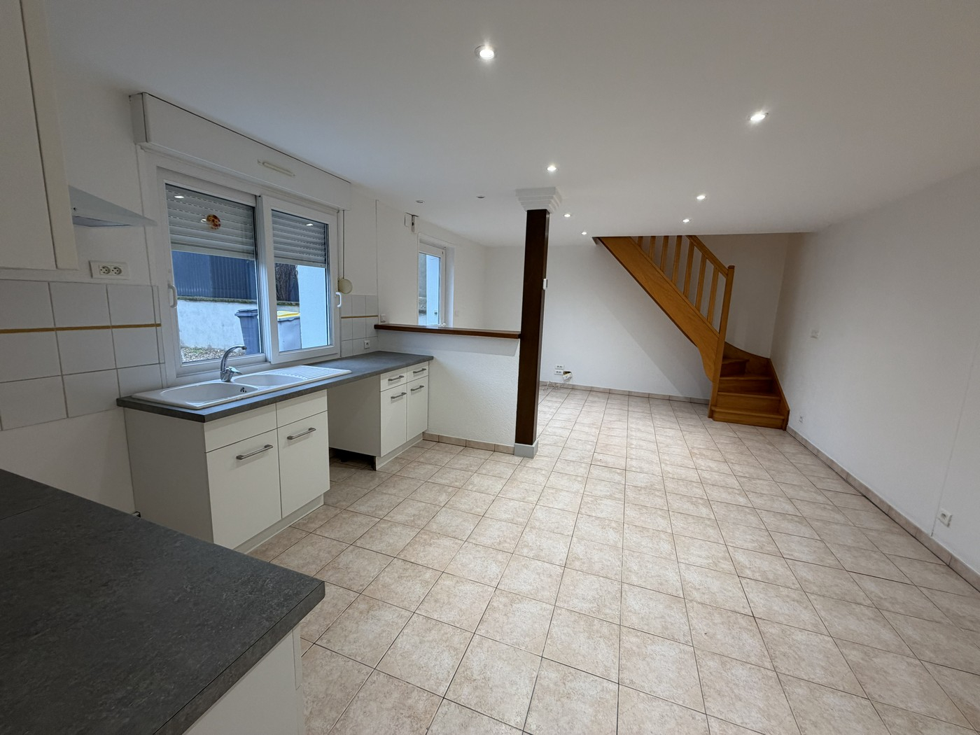 Rue Maréchal Foch - Maison d'env. 78m², comprenant un vaste séjour avec cuisine équipée ouverte, salle d'eau, buanderie, wc et un étage composé de 2 chambres (avec dressing et placard) et wc.