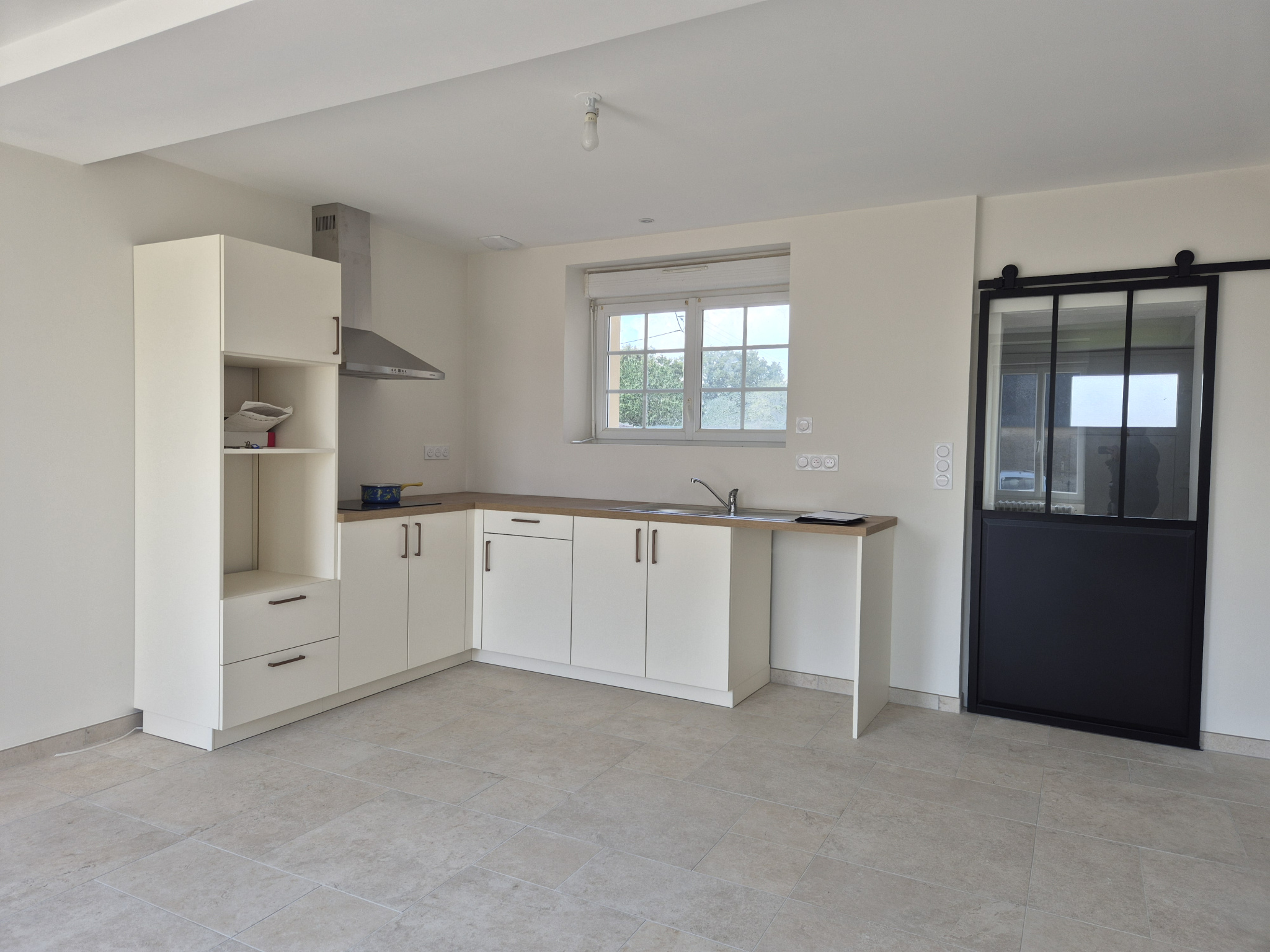A louer une maison Individuelle de 95.60 m², comprenant une entrée, salon séjour ouvert sur cuisine équipée (feux 4 plaques gaz bouteille, four, lave-vaisselle réfrigérateur, équipement en option) et aménagée, chambre, salle d'eau, toilettes.