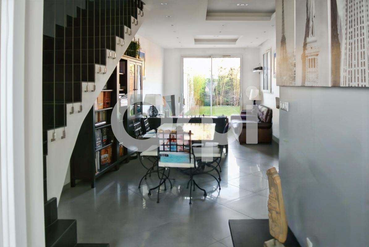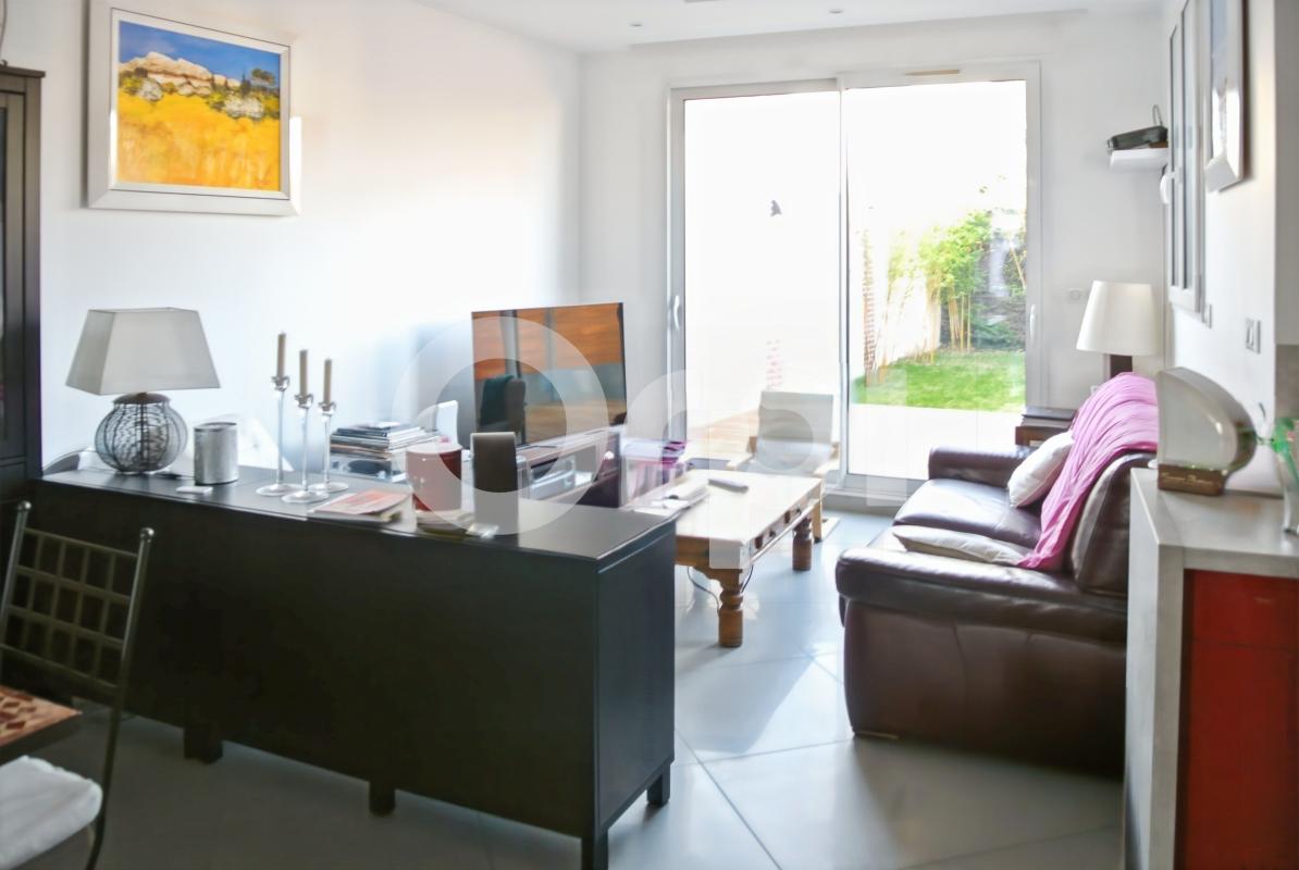 Dans quartier pavillonnaire, maison mitoyenne de 2015 : séjour lumineux avec cuisine ouverte semi-équipée, un bureau et salle d'eau. A l'étage : trois chambres et salle de bains. Un jardin clos et places de parking. Libre au 1er avril 2026.