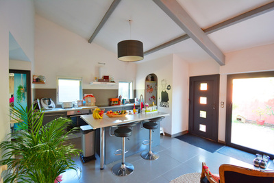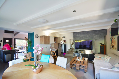 Dans quartier résidentiel, proche grands axes, maison mitoyenne de 131m² en triplex. Elle se compose en rdc d'un séjour, d'une cuisine ouverte entièrement équipée avec coin cellier et d'un wc indépendant, en étage d'une chambre de 25m²...