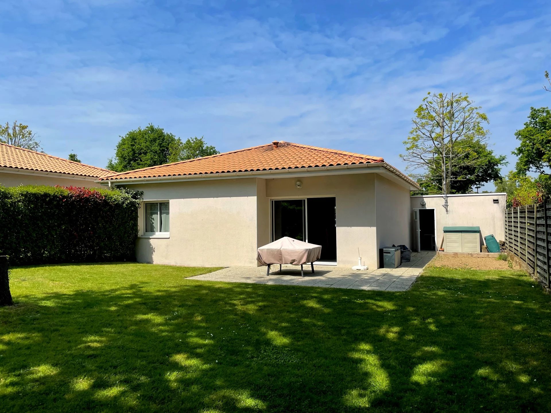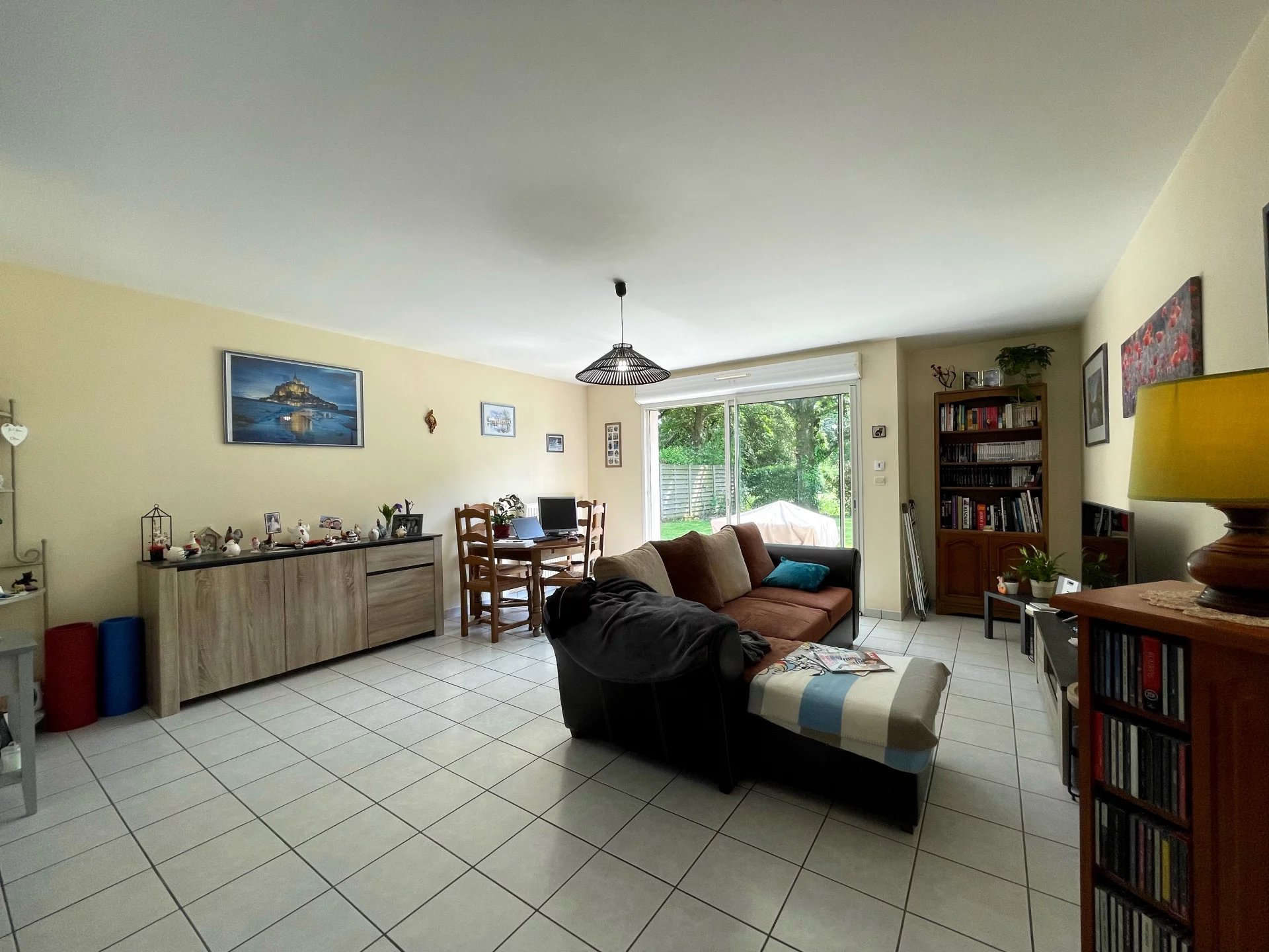 La pièce de vie est exposée sud et donne sur la terrasse du jardin.
